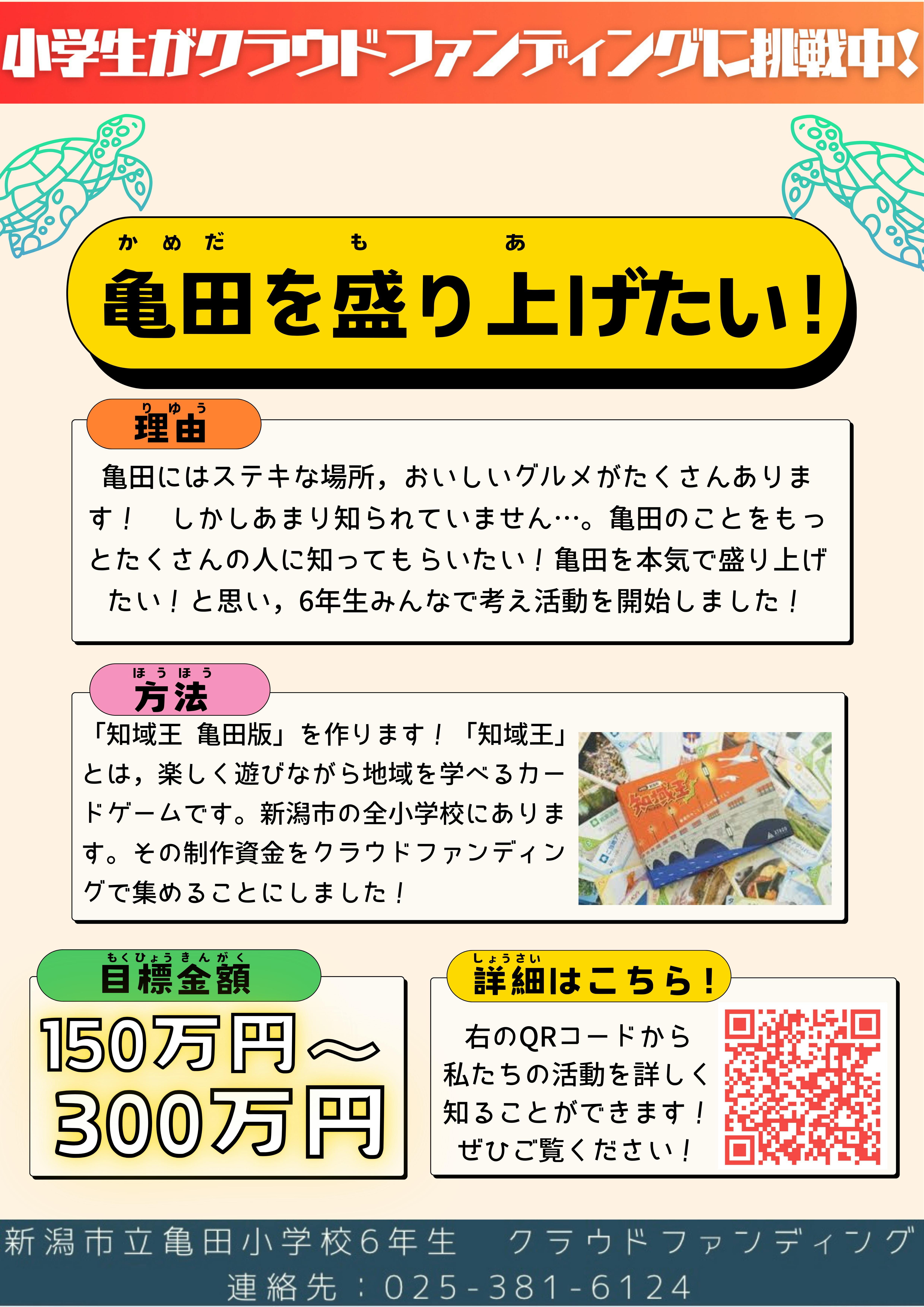 ついに,亀田小学校6年生によるクラウドファンディングがスタートしました! スタートよりご覧,ご支援いただきありがとうございます。
