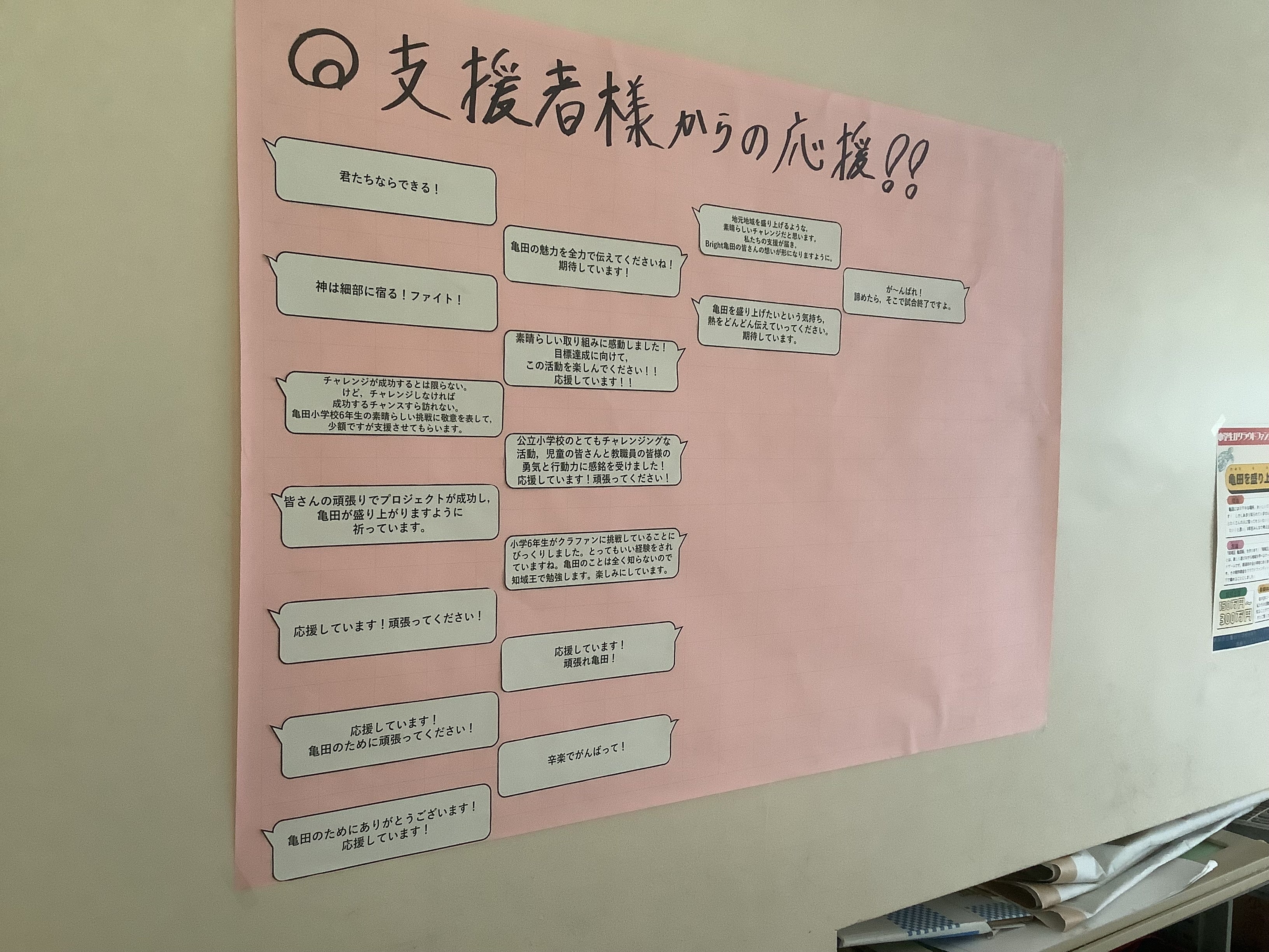 また,支援者の皆さんから頂いた応援メッセージは全て掲示させていただいています。