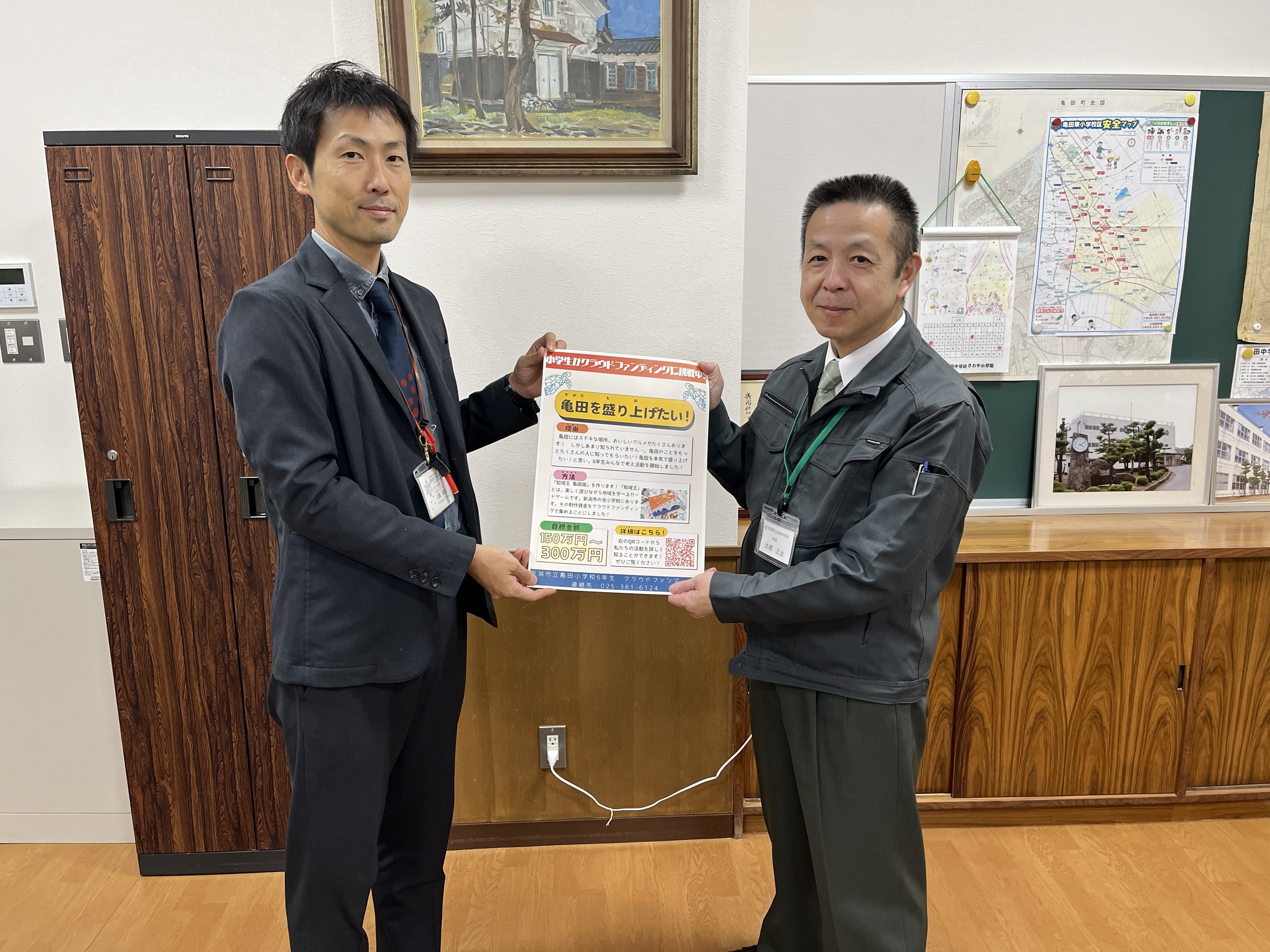 まずは、オンラインでプレゼンした亀田地域の小中学校へポスターを届け、掲示してもらいました。