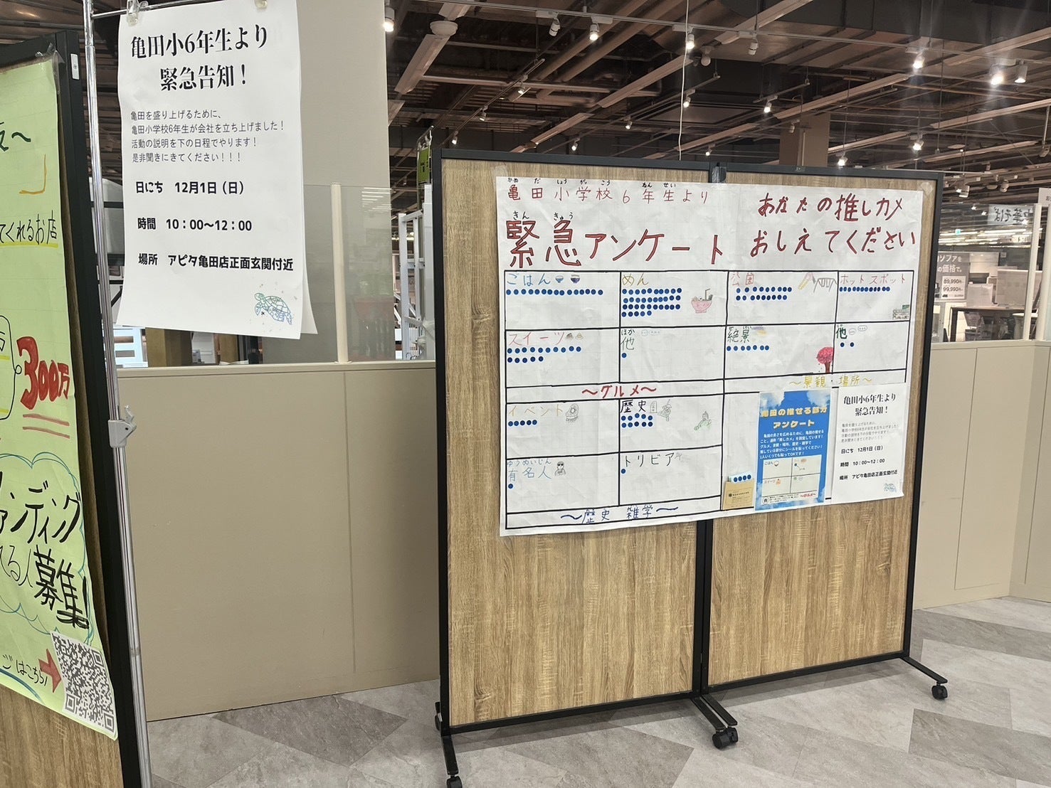 先日活動報告でもお伝えしましたが、アピタパワー亀田様のご協力により、なんと店内に特別ブースを作っていただきました!それだけでなく、イベントまで行えることになりました!ぜひ皆様もご参加いただけると嬉しいです!以下詳細です!「緊急企画!あなたの推しカメ、教えてください〜ブライト亀田の取り組み説明会〜」日時:12月1日(日)10:00〜12:00場所:アピタパワー亀田店1F 正面玄関前(予定)内容:知域王作りに向けて、自分たちだけでなく、亀田地区の皆様の声も参考にしたいという思いから、皆様のおすすめの「グルメ」「歴史・雑学」「景観・観光名所」「その他なんでも」をアンケートいたします。また、お時間いただければブライト亀田の社員(子ども達)より活動の趣旨を説明したいと思います。知域王体験(新潟市版)もできます!ぜひご参加ください!