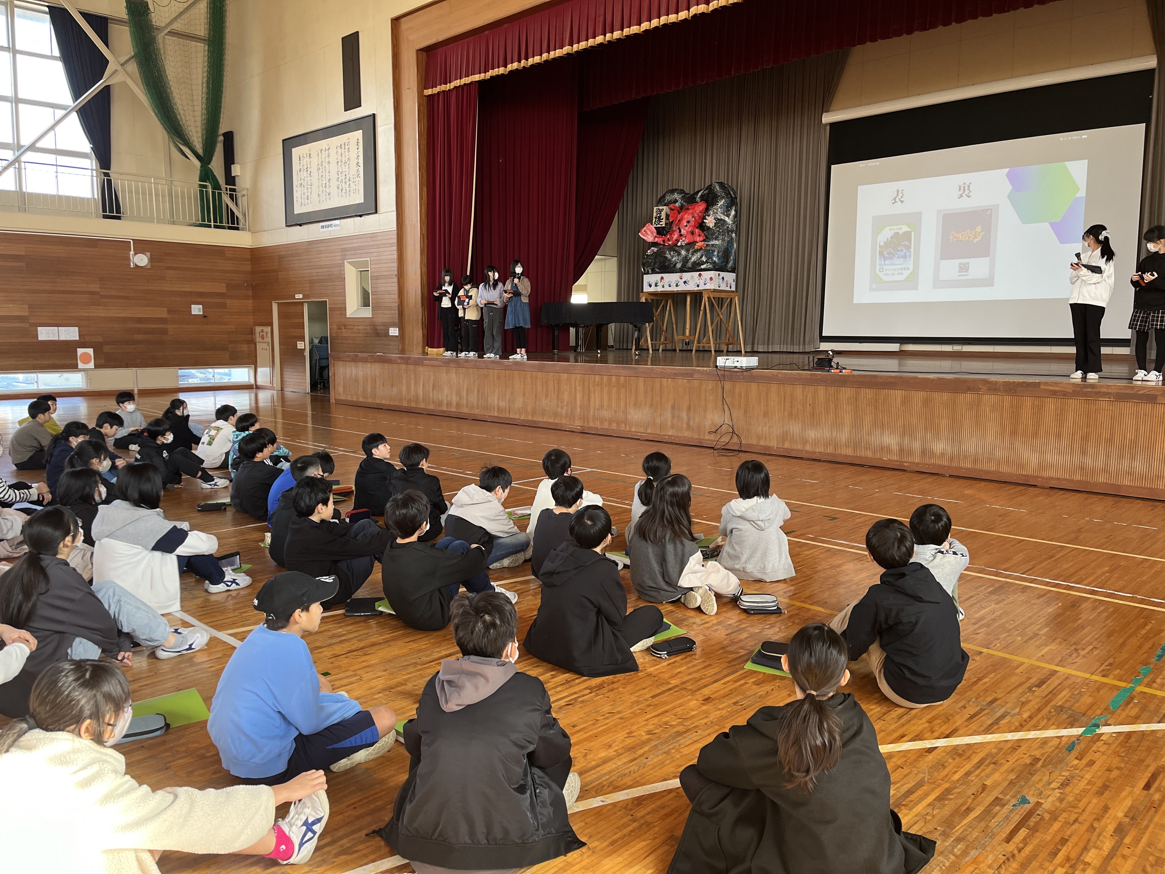 今日は授業参観の後,保護者の方や地域の方に活動の説明を行いました。参加された方一人一人へカードを手渡しし,「知域王」の魅力を伝えました。とても緊張していた様子でしたが,お互いに声を掛け合い,一生懸命発表していました。6年生の熱い思いが伝わったかと思います。保護者の方からは肯定的な意見と温かい応援のコメントをいただき,大変嬉しかったです。ありがとうございました。
