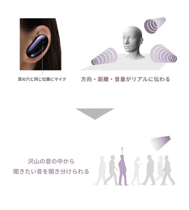 耳穴の位置にマイクを配置するバイノーラル方式を採用しています。音の前後左右を正確に再現することで、遠くの音は遠く、近くの音は近く感じる立体的な聞こえ方の忠実な再現を可能にしています。