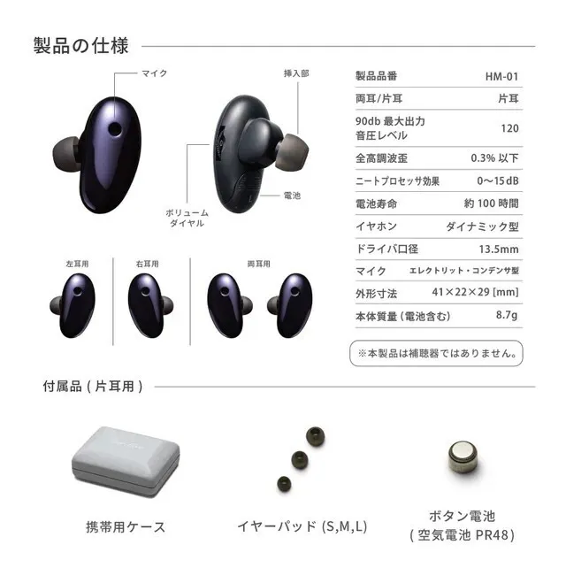 当社初代社長は、「誰にでも綺麗な音を楽しんでもらいたい」と音の方向性や自然な聞こえにこだわっていました。自然な音、人に馴染む音を目指して音声明瞭化回路を搭載し、マイクが耳穴の場所に位置するバイノーラル方式を採用し、遅延時間が無いアナログ回路、そして心地よい音質にこだわって製品開発を行ってきました。