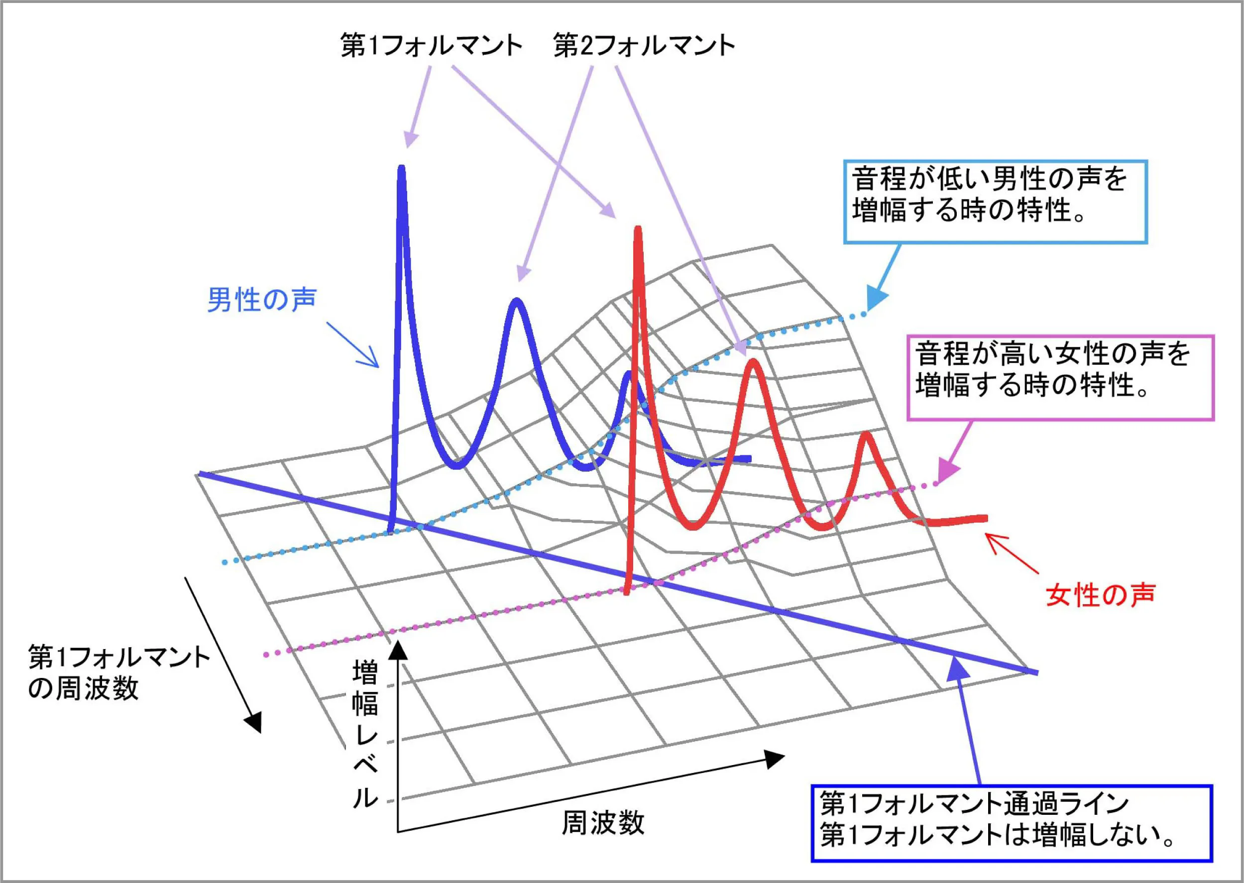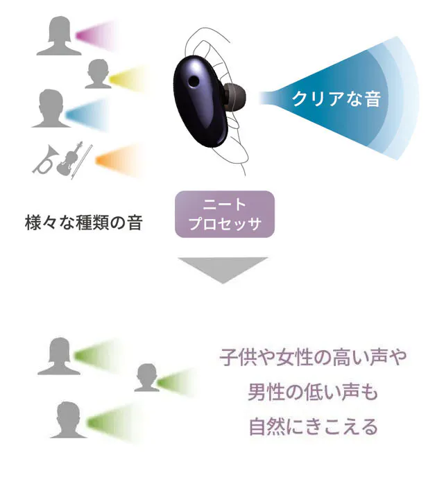 男性の声に合わせた増幅特性のままだと、女性や子供の声がキンキンしたり、距離感が大きく狂うことがあります。ニートプロセッサは自動的に周波数特性を調節して音がキンキンするのを防ぎ、既に聴こえている成分は増幅しないので、音の距離感を正確かつ自然な音質で伝えます。