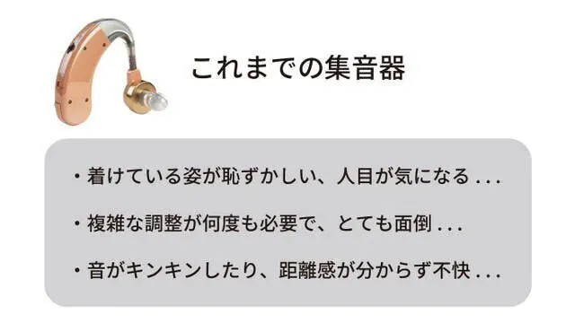 例えば皆さんは、親や祖父母に集音器を買っても、不自然な音を嫌がったり、年寄り扱いされることを嫌がって、仕舞いっぱなしになっている事はありませんか?また、調整が面倒ではないでしょうか?