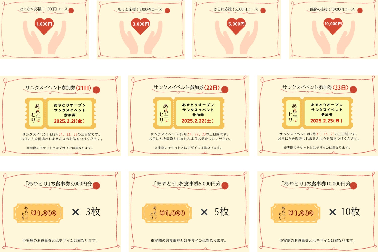 ご支援のお返しとして、『あやとり』で使っていただけるお食事券や、サンクスイベントの参加券をはじめ、佐賀で子育てをしながら作品づくりを楽しまれているママ作家さんたちの子育てグッズや癒しのアイテム、佐賀で育った美味しいお茶やちょっと珍しいお酢、そして、各種動画配信サイトで動画配信している母ちゃんならではの、動画による企業さまの広告など、バラエティーに富んだリターンをご用意しました。