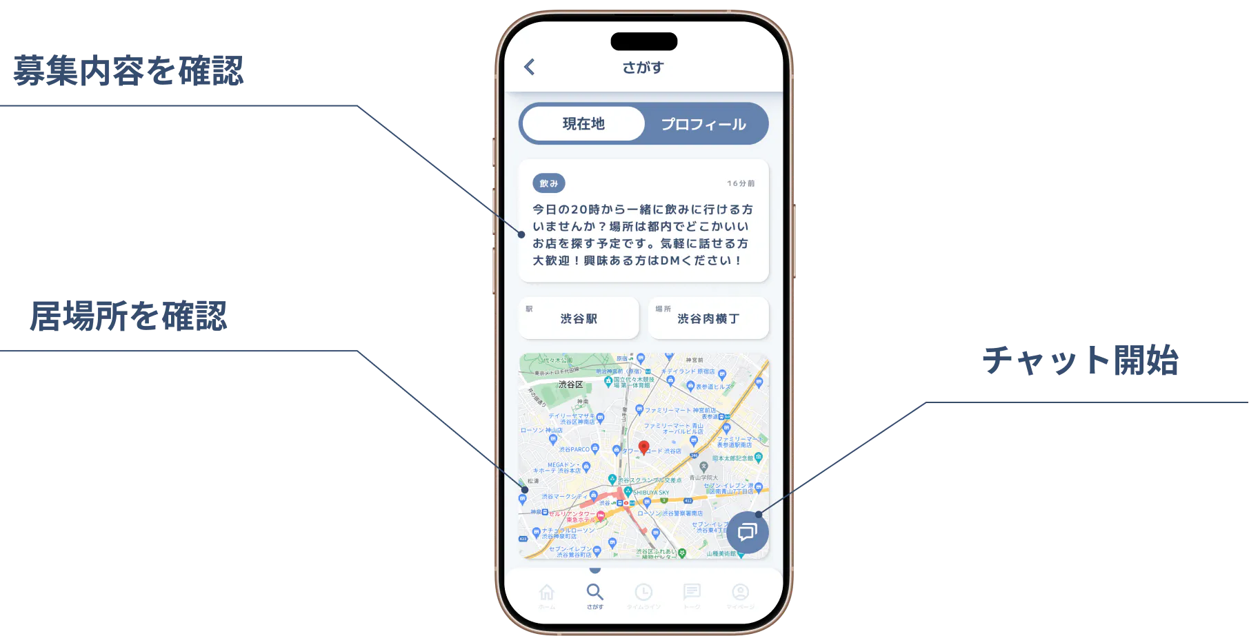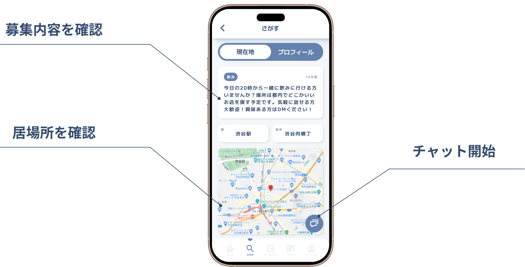 相手のプロフィールから、募集内容と位置情報を見ることできます。