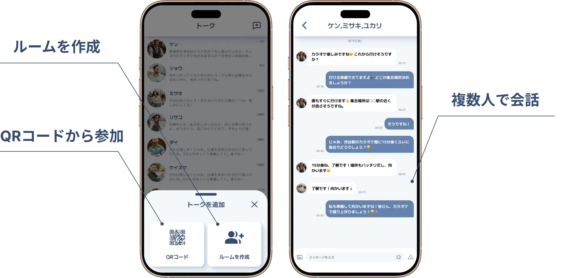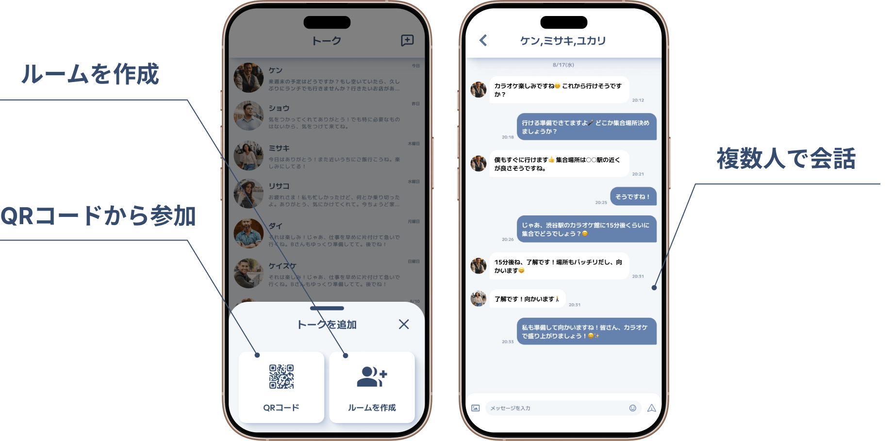 トーク一覧から新しいルームを作成することで、複数人でチャットすることができます。