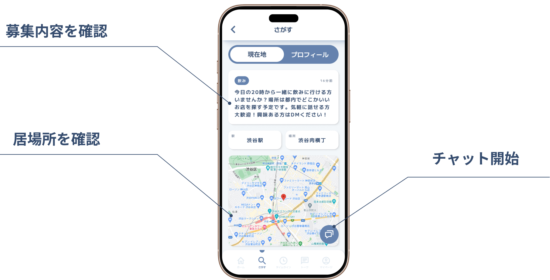相手のプロフィールから、募集内容と位置情報を見ることできます。