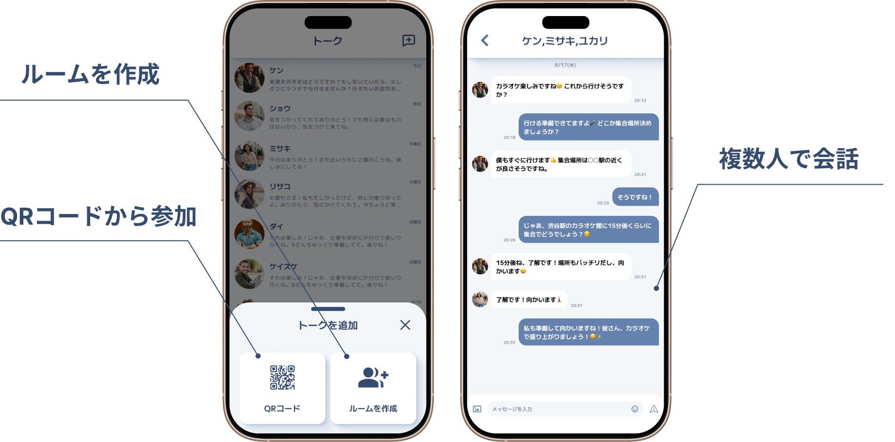トーク一覧から新しいルームを作成することで、複数人でチャットすることができます。