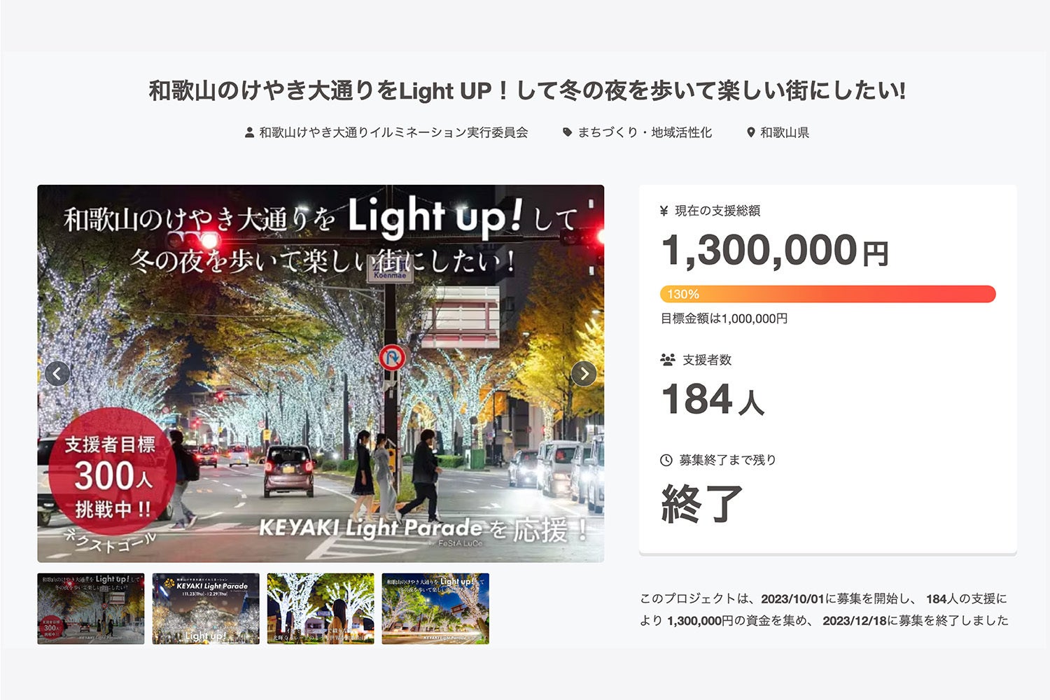 1回限りのイベントでは、和歌山をよりワクワクする街にすることはできません。つまりこのようなイルミネーションによる光のインフラは継続的に開催していくことが必要です。「和歌山を少しでも盛り上げたい!」という想いや、「和歌山県外にいるけれど、和歌山をワクワクした街にしたい!」という想いを持った人を一人でも多く増やしたい。一緒にプロジェクトを作り上げたい。この目的を達成する手段として、今年もクラウドファンディングを行います。あなたも是非一緒に、「KEYAKI LIGHT PARADE by FeStA LuCe」に関わってみませんか?