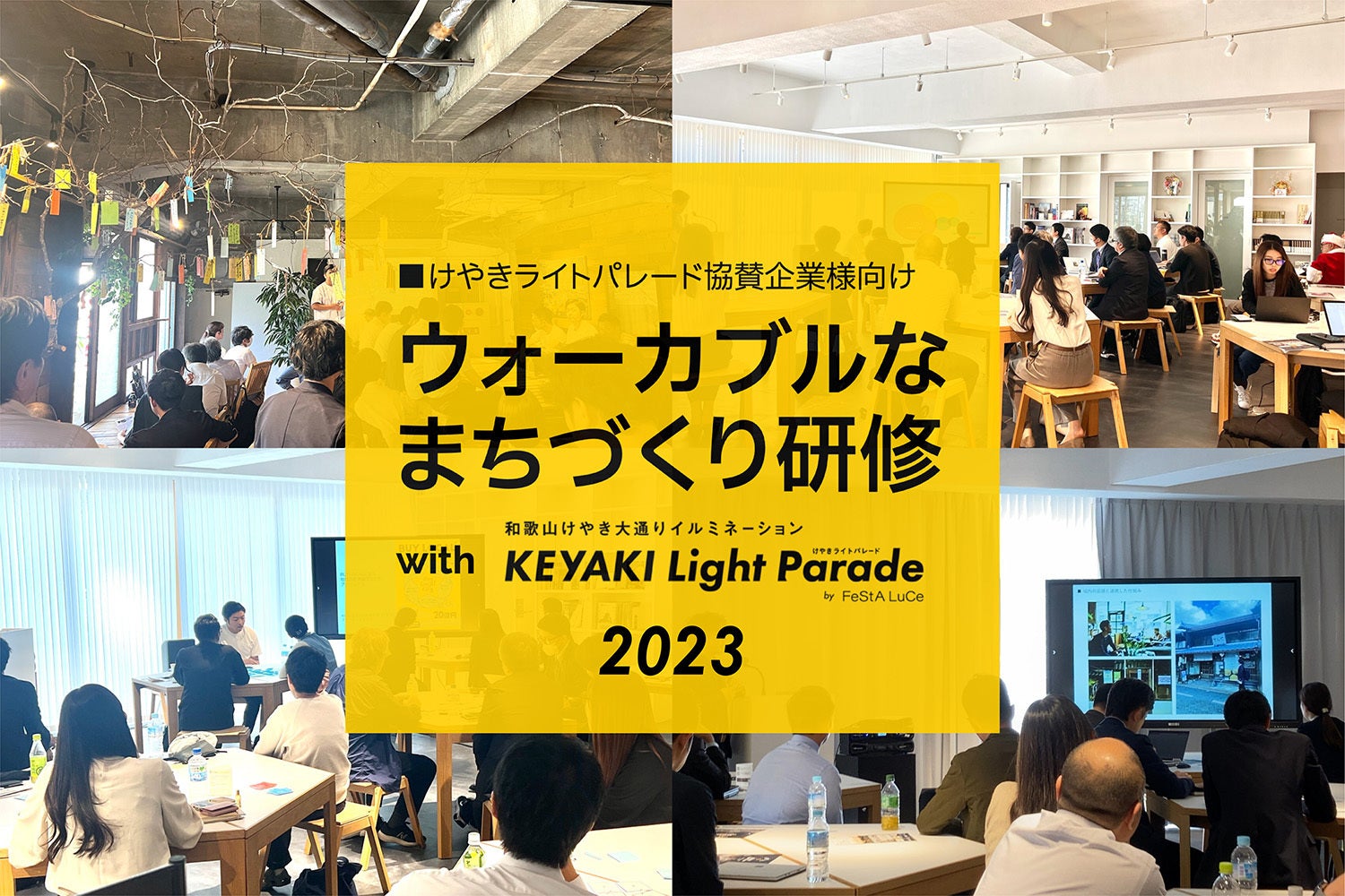 けやきライトパレードを継続していくためには、人々が意識して夜に出かけ地元の店でお金を使い、地域経済を回すことが必須です。このようなナイトタイムエコノミー活性化による経済効果を和歌山に創出するべく昨年度は「ウォーカブルなまちづくり研修」を実施しました。3回のワークショップを経て生まれた3つのアイデアは実際に開催され、大きな反響を生みました。