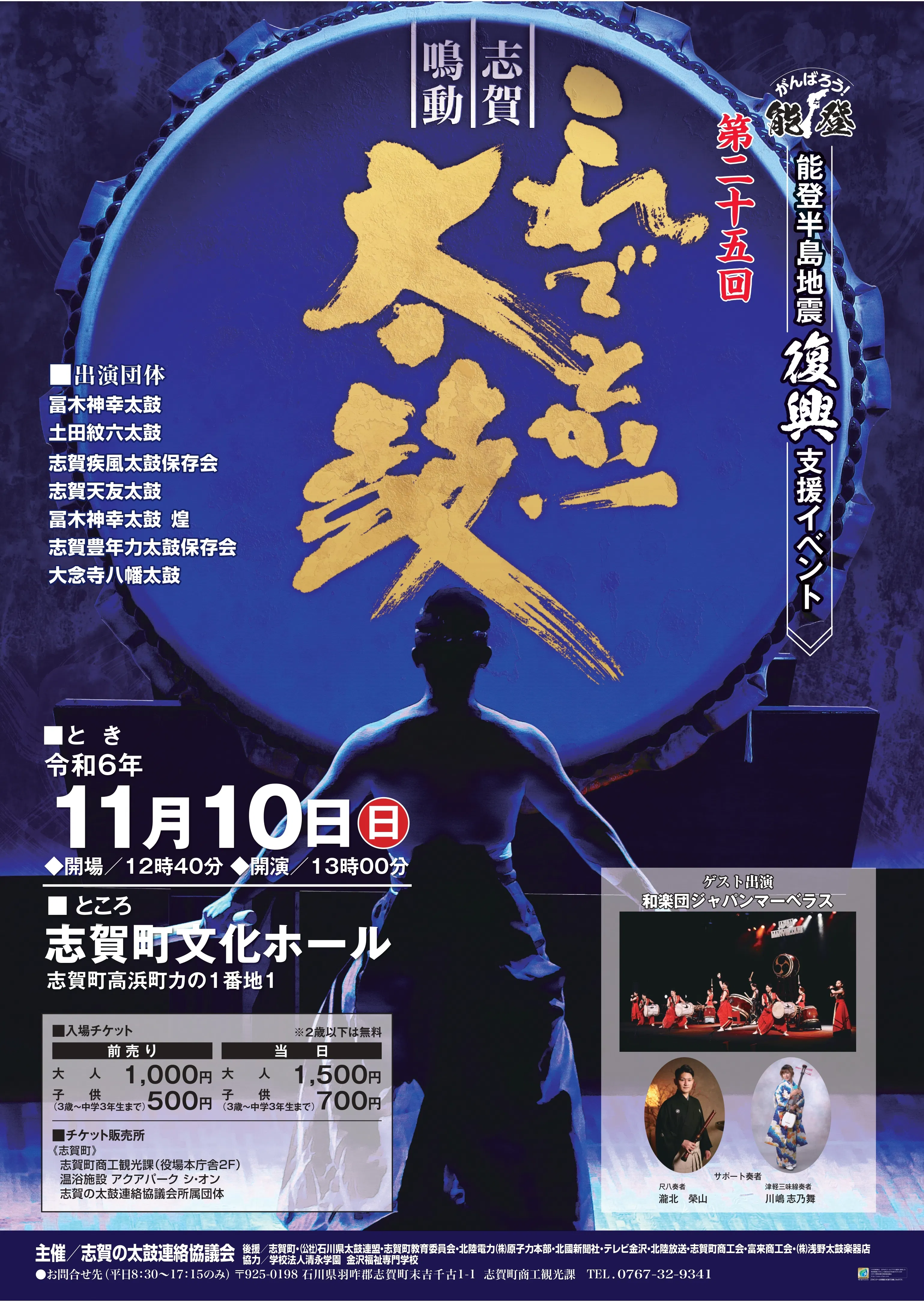 今回、和楽団ジャパンマーベラスの西口団長は約30年の時を経て、志賀町に出向き、志賀町復興応援のために、我々の思いに賛同いただき、志賀町のための曲を作成し、志賀町の太鼓団体の方々と共にコラボレーション演奏を行います。
