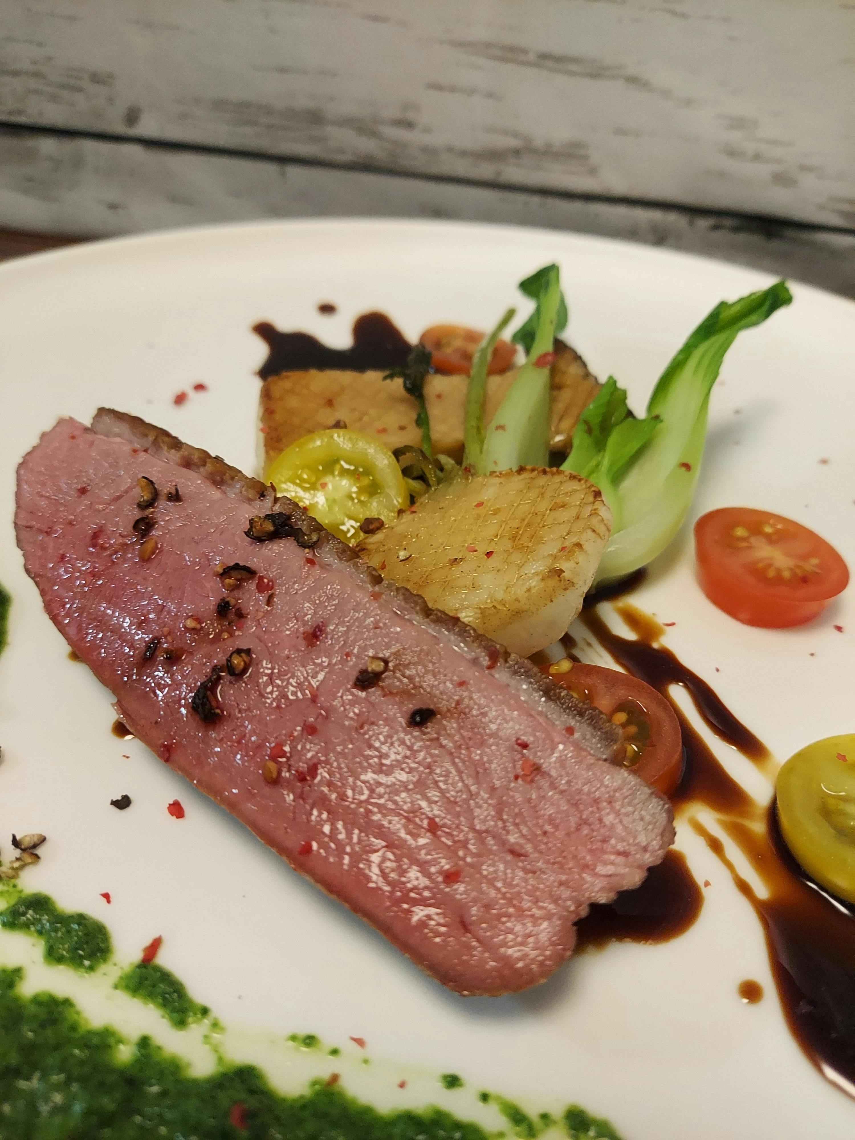 岩手県産の肉厚の鴨を低温でじっくりロースト、力強い旨みと溢れる肉汁、鴨特有の癖はサルサヴェルデ(パセリを中心としたハーブのサッパリとしたソース)
