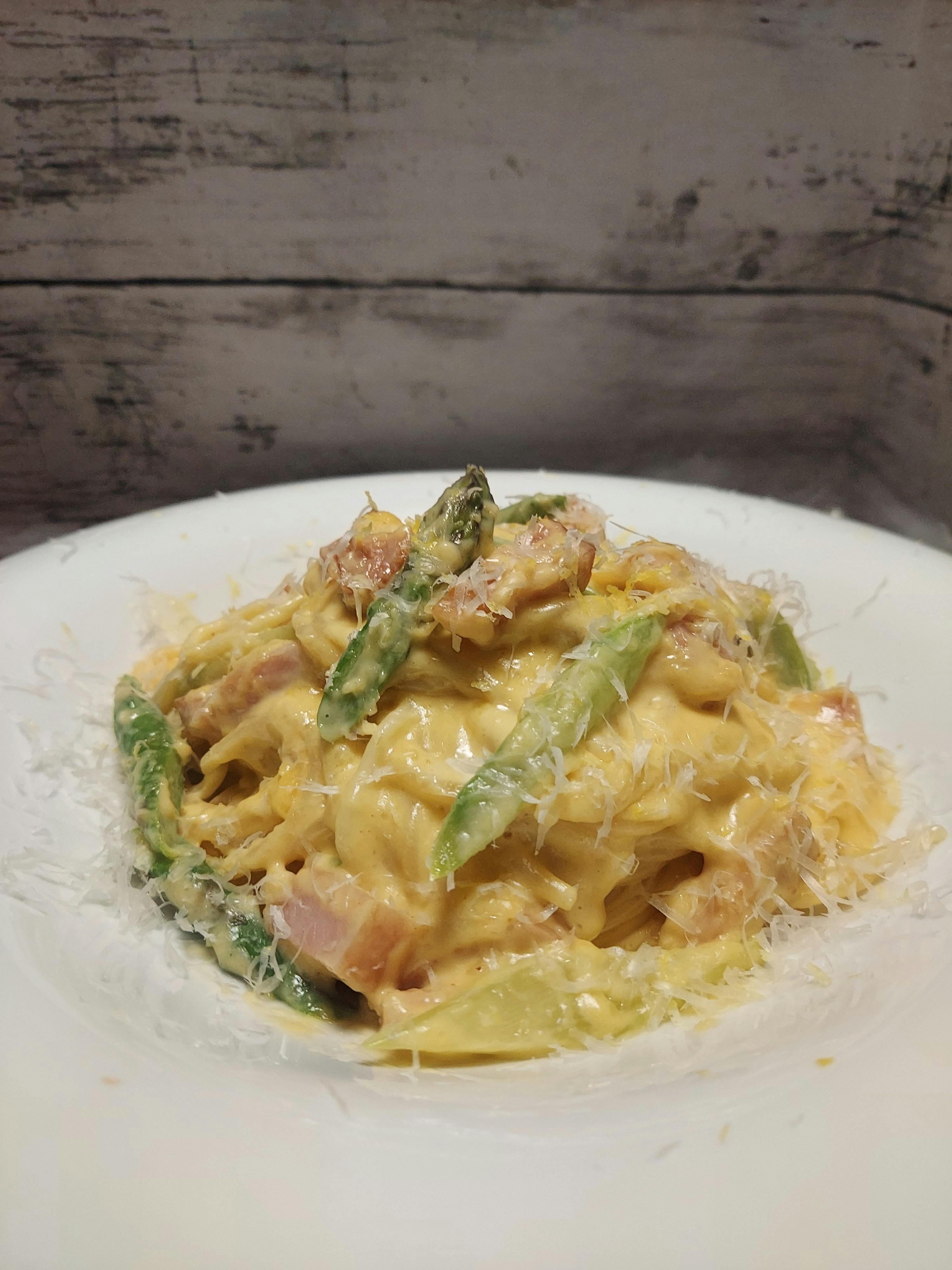 アスパラは卵黄とよく合うので、カルボナーラには最適です