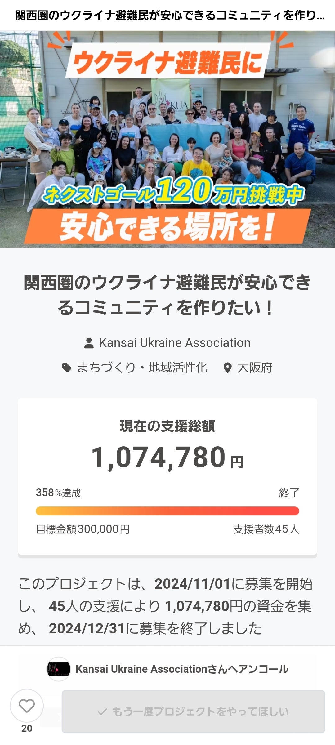 2025/01/07 14:20皆様本当に心より感謝申し上げます。11月1日から12月31日までのクラウドファンディングで目標『300,000』からスタートさせて頂いて最終支援金額45人の方々が心温まるご支援頂きなんと『1,074,780円』の支援総額が集まり、達成率358%で終了することが出来ましたことを心より感謝申し上げます。関西ウクライナ友好協会はウクライナ支援を始め、避難民様のコミュニケーションの場所づくりの大切さを活動していく中感じました。その中でどのようにすればいいのか?と考える日々でしたが、大阪平野ロータリークラブにて講演会の機会を頂きその講演会でスバキリ商店小西様よりウクライナ支援としてクラウドファンディングのサポートをしていただける事となり、何も知識のない私たちに120%以上のお力添えを頂きこのキャンプファイヤーにてクラウドファンディングが行える事となりました。クラウドファンディングが始まる前から最終日まで本当にすごくサポートして頂き、このページに温かな皆様のご支援、お気持ちがこんなにも集めていただける事となりました。そして、クラウドファンディング中に、昨年の関西ウクライナ友好協会の毎日新聞の記事を見ていただいた長屋ストックバンクの松富様より、ウクライナ支援として大阪中央区谷町6丁目のレンタルキッチンスペースからほり悠で11月から毎週火曜日、水曜日とウクライナの家庭料理のお店『KUAkafe』をさせていただける夢のような機会を頂くことができ、避難民様のコミュニティの場所の第一歩を踏み出すきっかけとなりました。『KUAkafe』では避難民の皆様と支援してくださる日本の皆様とのコミュニケーションが互いに笑顔の時間となりとてもとても幸せ大切な時間だと感じ再度『KUAkafe』を毎日出来るようにと目標がはっきりした2ヶ月となりました。総支援金 1,074,780円キャンプファイヤー手数料(12%) 128,974円決済手数料(5%) 53,739円手数料・キャンペーン適用小計(17%) 182,713円手数料・キャンペーン適用にかかる消費税(10,0%) 18,271円手数料・キャンペーン適用合計 200,984円合計振込手金額 873,796円上記の金額が1月31日に入金予定となりました。コミュニケーションの場所づくりを日々頑張って参ります。そしてこんなに多くの方にご支援いただける事、皆様からの心あたたかなメッセージはとても励みとなり心に響きました。皆様ウクライナのことを想って頂き本当に本当に心から感謝申し上げます『Я вам щиро дякую』 もっと見る