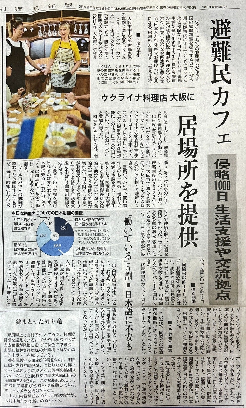 そして、クラウドファンディング中に、昨年の関西ウクライナ友好協会の毎日新聞の記事を見ていただいた長屋ストックバンクの松富様より、ウクライナ支援として大阪中央区谷町6丁目のレンタルキッチンスペースからほり悠で11月から毎週火曜日、水曜日とウクライナの家庭料理のお店『KUAkafe』をさせていただける夢のような機会を頂くことができ、避難民様のコミュニティの場所の第一歩を踏み出すきっかけとなりました。