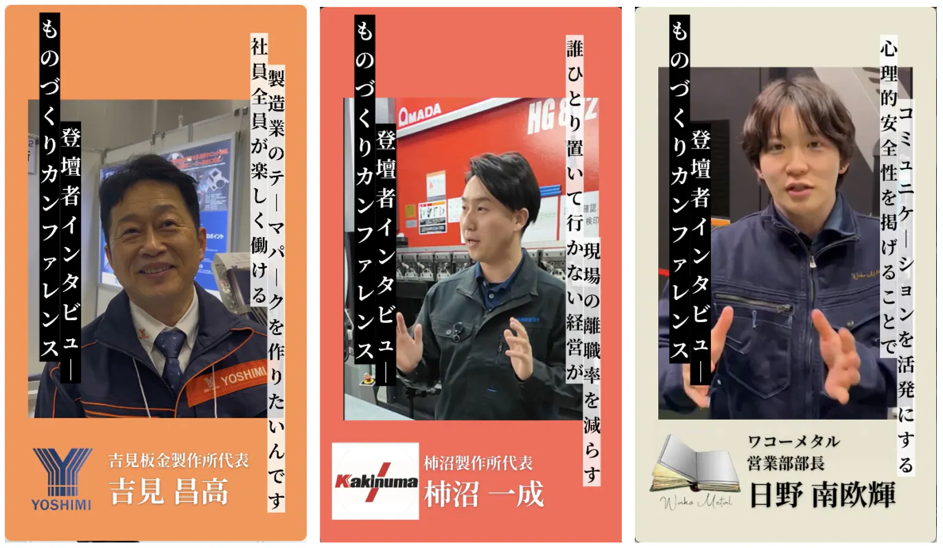 登壇者4名のうち、3名は板金加工業界の方々です。板金に精通している所は共通ではありますが、今回のカンファレンスでは業界について深掘りした話ではなく、“製造業の今”にスポットを当てて課題の攻略法、社員とのコミュケーションの取り方、一風変わった社内の決まりなどの話題を中心にカンファレンスを盛り上げます。
