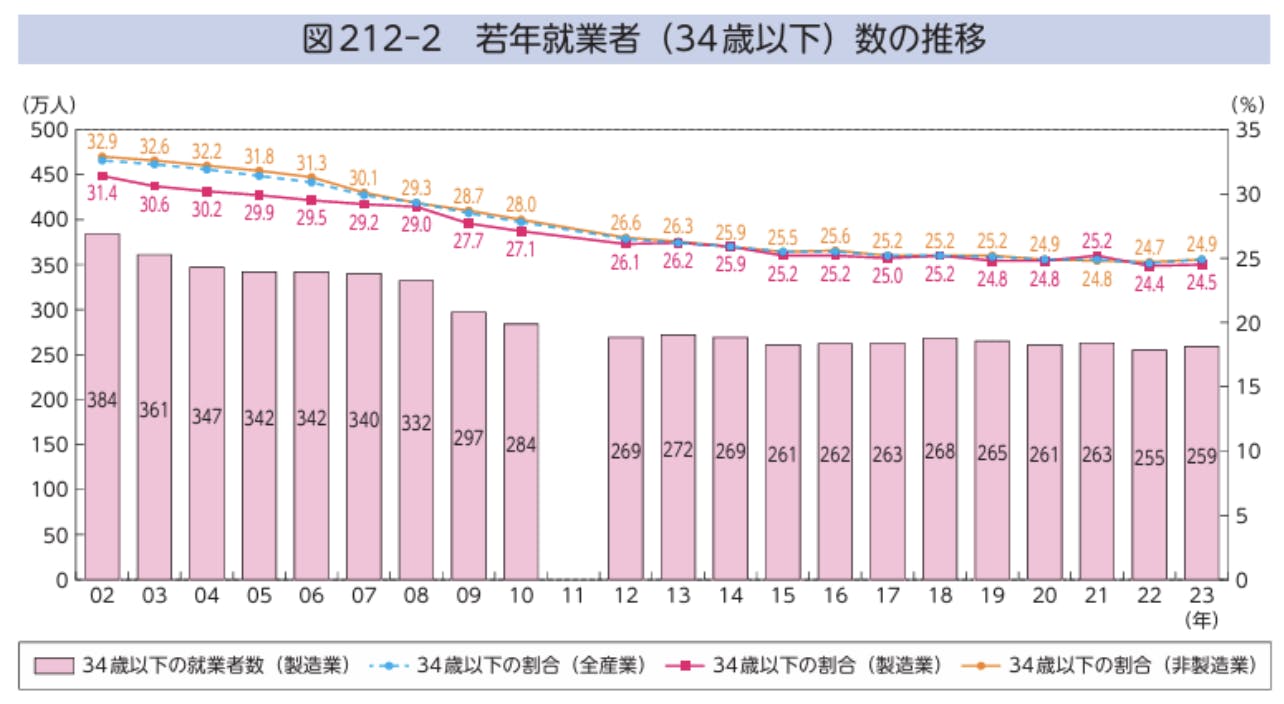 製造業を取り巻く環境は深刻さを増しています。特に人財不足と技術伝承の問題は昨年のものづくり白書でも課題のトップに上がるほど深刻化しています。製造業の若年就業者が2002年の384万人から2023年には259万人にまで減少しました。若年層のものづくり離れが深刻化する事で当然、会社で培われてきた技術も次の世代に伝承されません。日本のものづくりに対するこだわり、摺り合わせと言われる突き詰めるワザが失われていく事にとても心が痛みます。