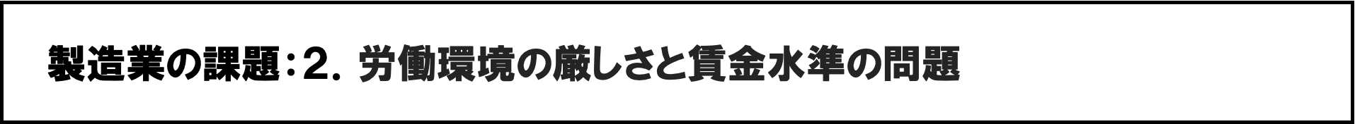 残念ながら製造業は未だに「きつい」「汚い」「危険」といった3Kのイメージが強いのも課題です。結果、人財確保が難しくなっている現状に結びついている可能性が高いです。更に賃金が他業種と比較して低い傾向があり優秀な人財を確保することが難しくなっているという現実があります。