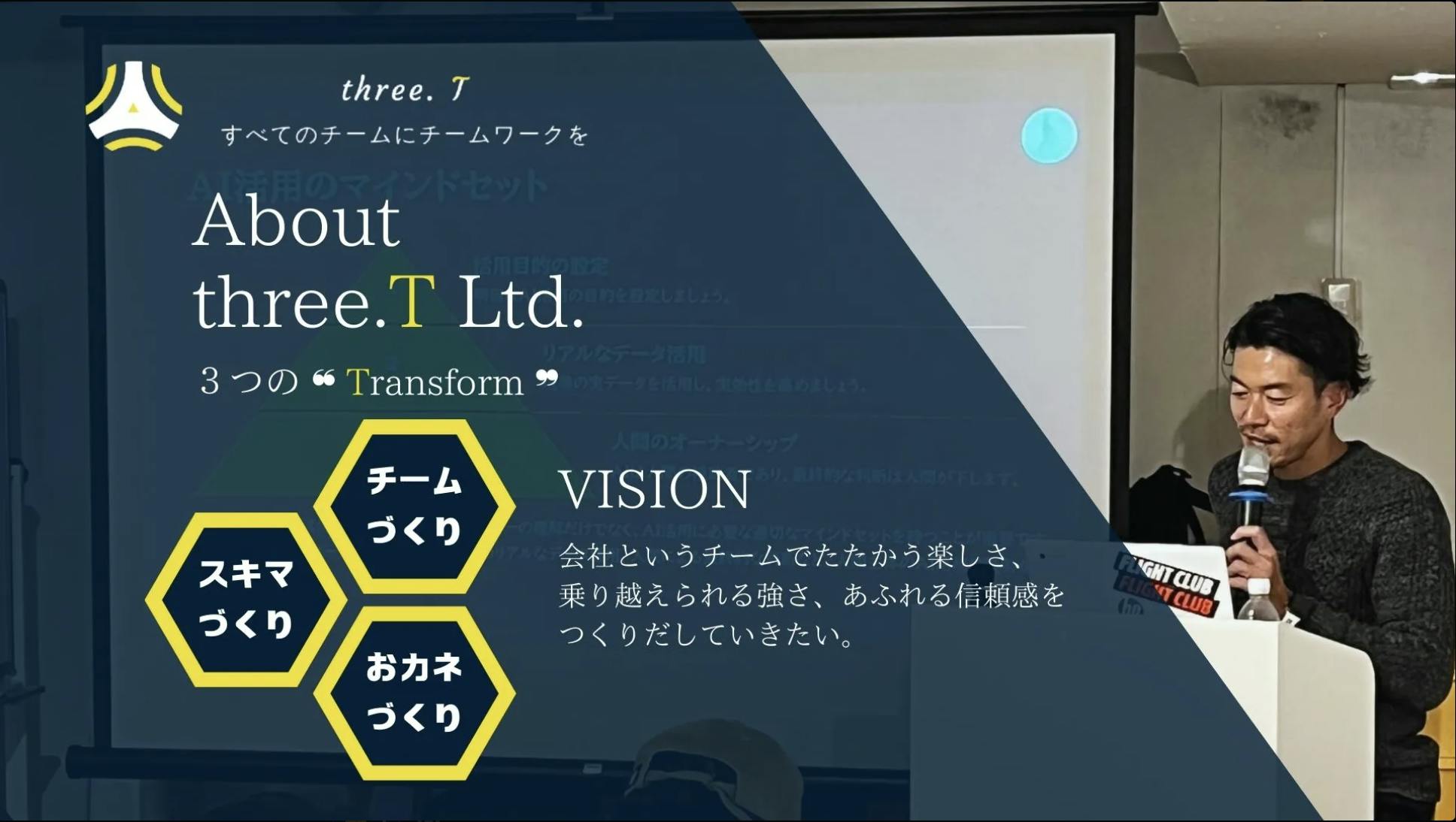また、最後にご紹介したthree.T様は、元々製造業界の方であり、今もものづくり企業様に訪問しAIを駆使して業務効率化を図られている方です。今回のカンファレンスを通じて得たヒントを、AIを活用してより効率よく現場に理解してもらう。そんな思いもあって、ものづくり×AIの話をして頂きたいと思います。