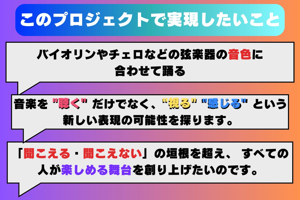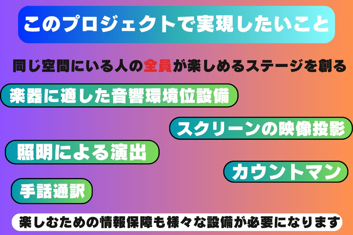 • 聴覚障がいを理由に「音楽を楽しむことができない」という壁を取り払いたい。そして、観客全員が「純粋に良い」と思える新しい形のエンターテインメントを提供します。