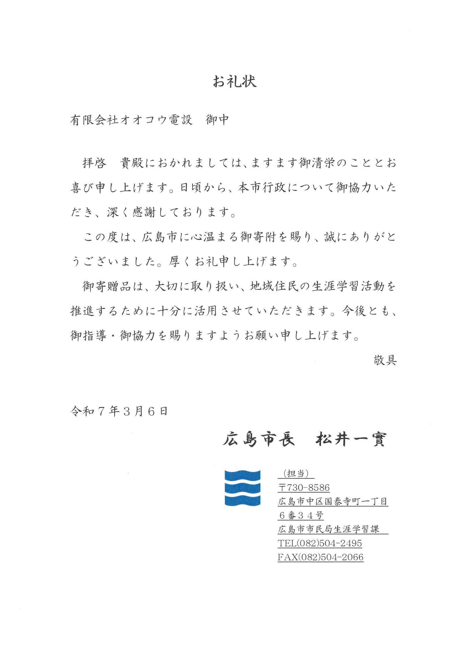 広島市より感謝状を頂きました。