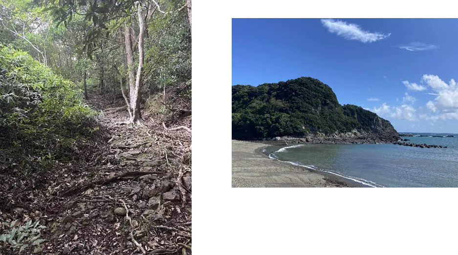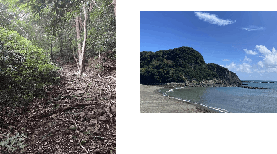 古道から海は見えないのですが、時折り、潮騒が聞こえたりしますし、国道に降りる辺りでは周りの樹林の間に太平洋が望めます。本州最南端の潮岬に近く、温暖な気候なので真冬でも歩いて頂けます。当日、楽しみにしております。