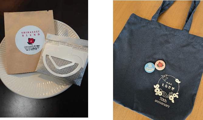お礼として、椿温泉しらさぎオリジナルコーヒー ドリップバッグ 5袋 またはオリジナルクラウドファンディング限定トートバッグをお送りします。各々には、オリジナル缶バッジ(柄の指定はできません)を1個ずつ付けさせていただきます。