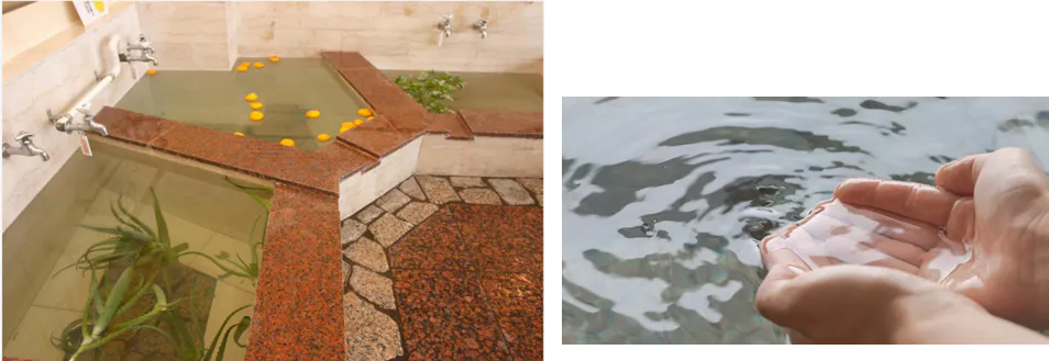 しらさぎには、海を眺めながら入る源泉かけ流しの大浴場と、地元で採れた果物や薬草が毎日変わる日替わり壺湯があります。1日3回の入浴で温浴効果を高め、老廃物を排出してスッキリデトックスと美肌・美白効果も期待できます。