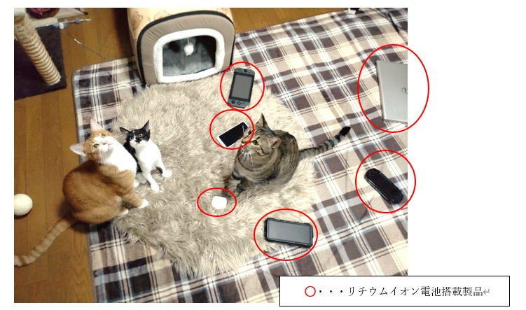家庭生活では、リチウムイオン電池は色々な製品に使用されており、表紙で紹介しました通りLIBが溢れている中で生活していることに気付いて下さい。又、猫ちゃんやワンちゃんと一緒に生活されている家庭も多くあります。これらのLIB搭載製品をペットが引っ掻いたり、噛んだりしてしまった場合にも同様のことが起きるかもれません。もし自宅を留守にしている間に火災が発生したら、留守番しているペットを失うかもしれません。
