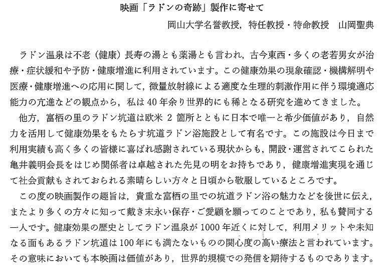 ●映画「ラドンの奇跡」を製作するにあたり、岡山大学名誉教授、特任教授・特命教授の山岡聖典氏よりメッセージをいただきました。