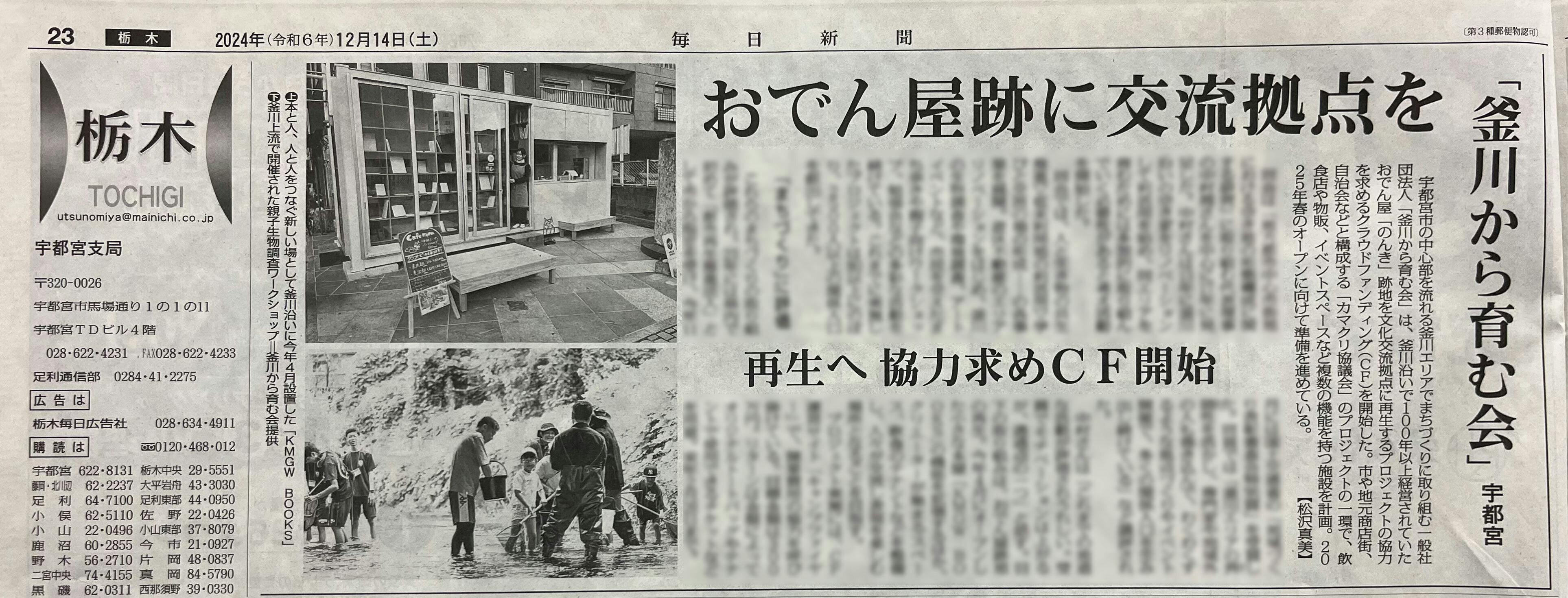本日12/14(土)の毎日新聞 朝刊に、【人と表現が集まるところ のんき】のクラウドファンディングと、先日表彰式があった国交省 「地域づくり表彰」が掲載されました!