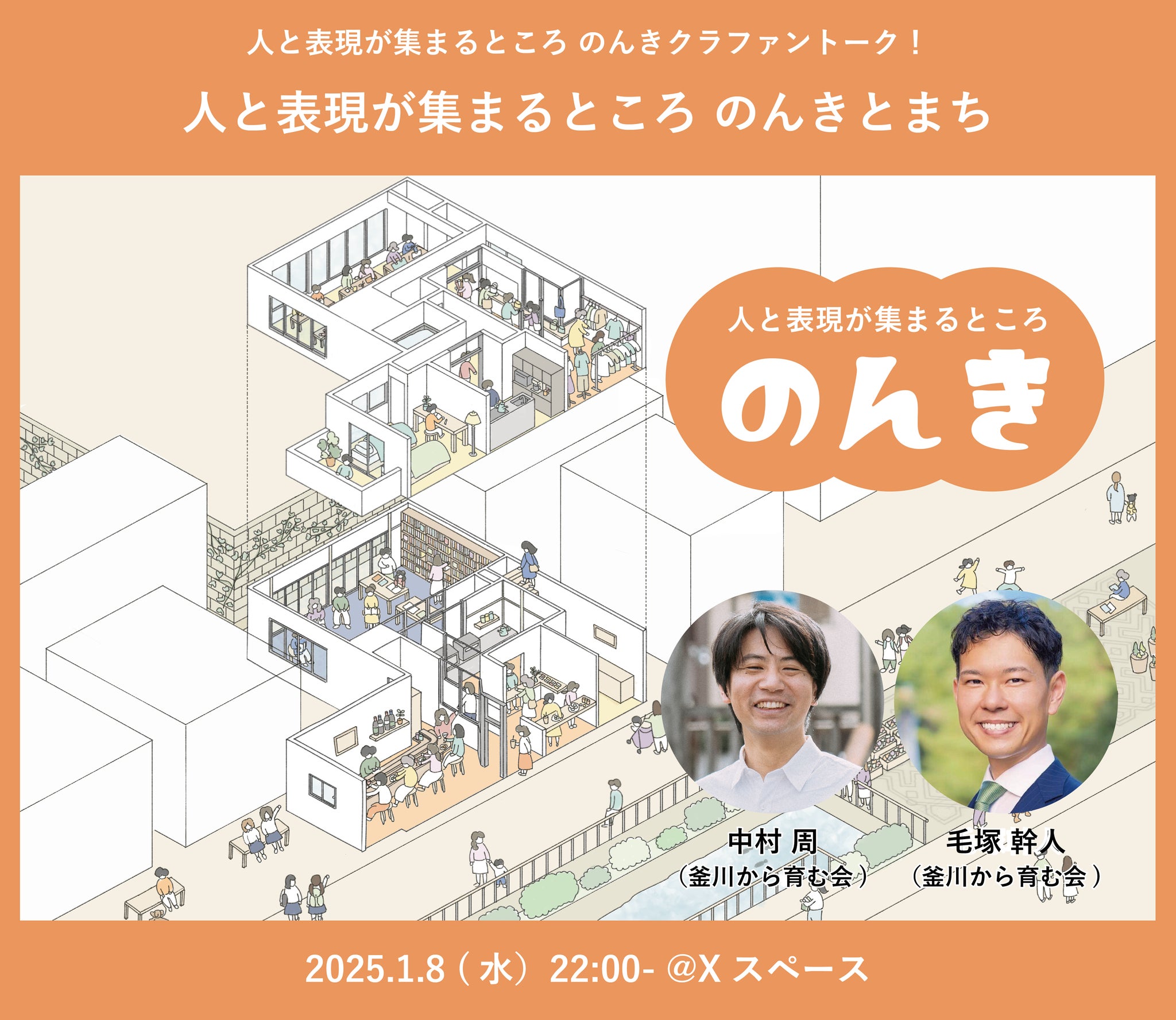 釜川から育む会の中村と毛塚が、1/8(水)22時から「人と表現が集まるところ のんきとまち」をテーマに、Xスペースにてトークします!