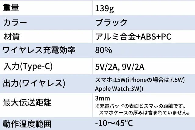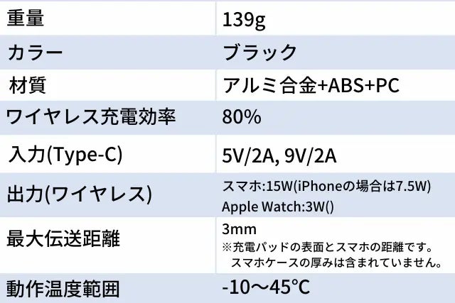 A:スマホ部分は最大10W(iPhoneは7.5w)、Apple Watchは最大3W です。