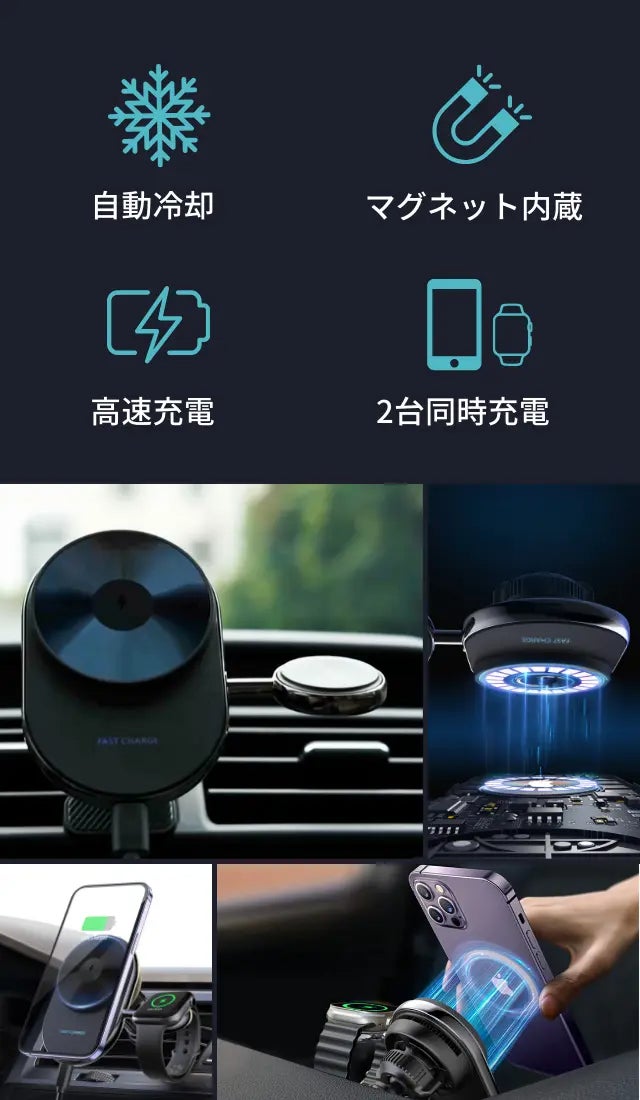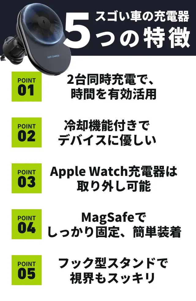 このスゴい車の充電器は、ススマホとApple Watchを同時に充電でき、冷却機能を搭載しているため、デバイスを安全に高速充電できます。安心してお使いいただける設計で、普段の生活がより便利に・快適になる。