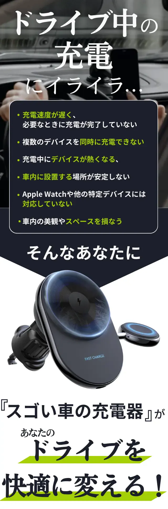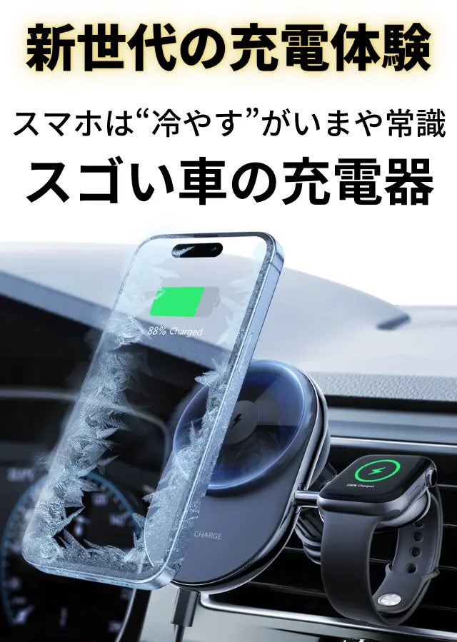 長距離ドライブでも、スマホもApple Watchも同時に充電。さらに、冷却機能で過熱も防ぎ、安心して使える充電器が登場しました!