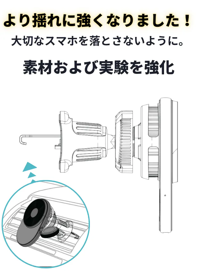 また、車内でもスマホを確実に固定してくれるので、悪路でガタガタ揺れる車内でも振動や衝撃にも負けず、あなたの大切なスマホをしっかりと保持します。