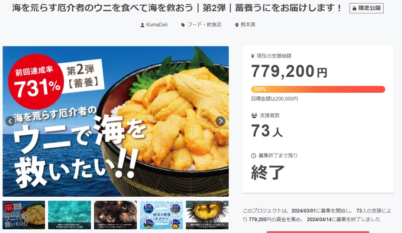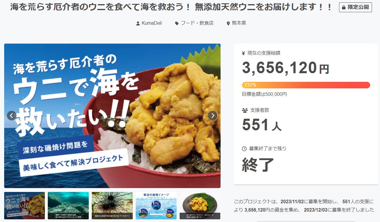 2023年11月に第1弾「海を荒らす厄介者のウニを食べて海を救おう! 無添加天然ウニをお届けします!!」では、予想をはるかに上回るご支援をいただきました。