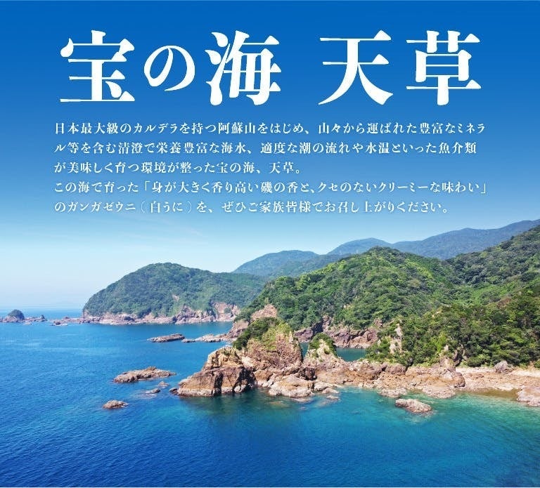 前述した通り天草には豊穣な海が広がり「身が大きく香り高い磯の香と、クセのないクリーミーな味わい」の白うにがご賞味いただけるのです。