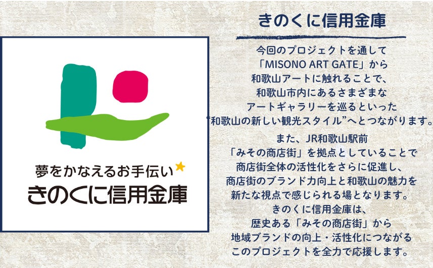 私たちは、「MISONO ART GATE」を通じて、和歌山の魅力を再発見できる場所をつくりたいと考えています。和歌山アートが人とまちをつなぐ“入口”となり、このまちに笑顔と創造があふれることを願っています。