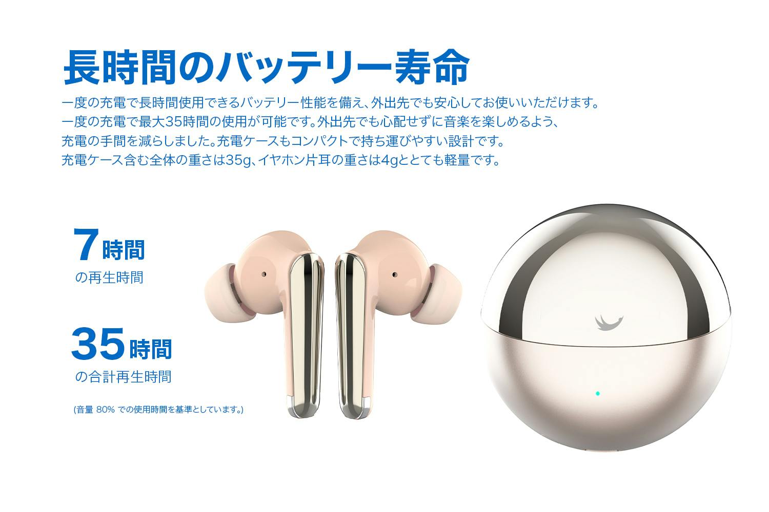 一度の充電で長時間使用できるバッテリー性能を備え、外出先でも安心してお使いいただけます。一度の充電で最大35時間の使用が可能です。外出先でも心配せずに音楽を楽しめるよう、充電の手間を減らしました。充電ケースもコンパクトで持ち運びやすい設計です。充電ケース含む全体の重さは35g、イヤホン片耳の重さは4gととても軽量です。