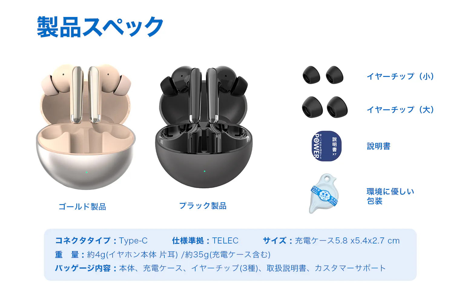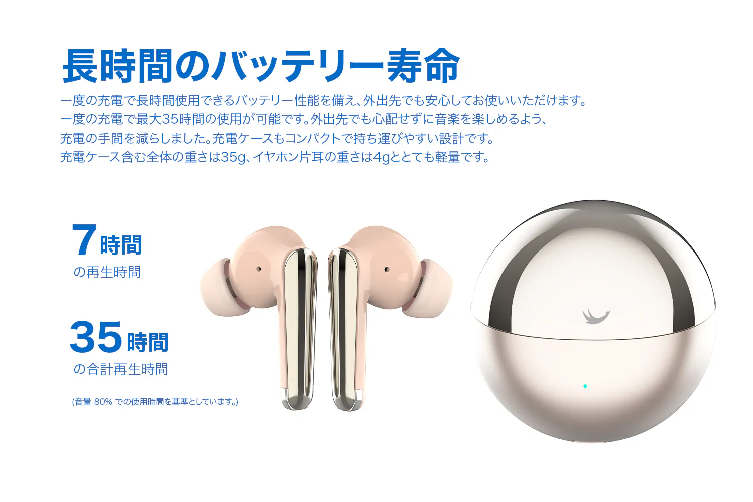 重量:約4g (イヤホン本体 片耳) / 約35g (充電ケース含む)
