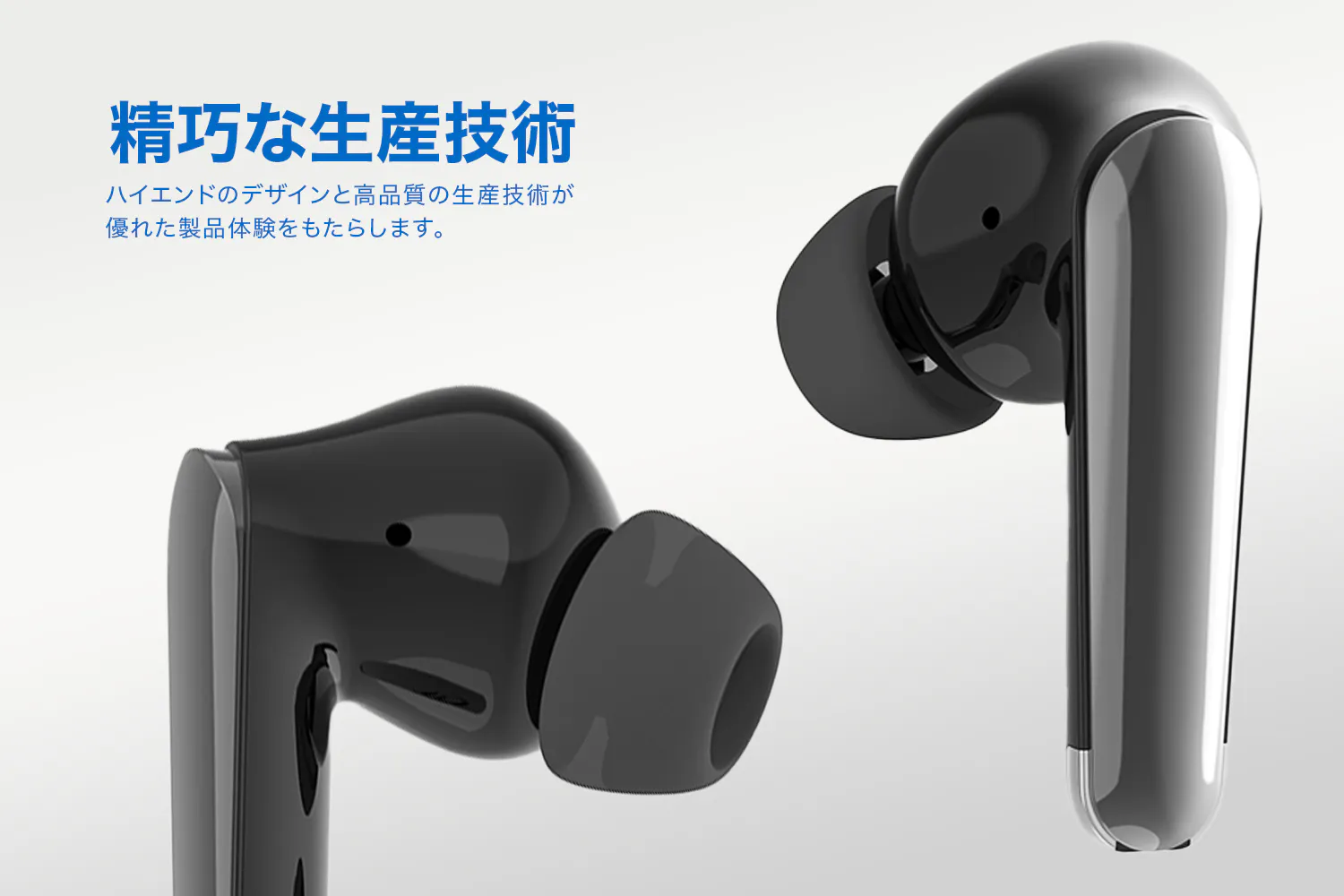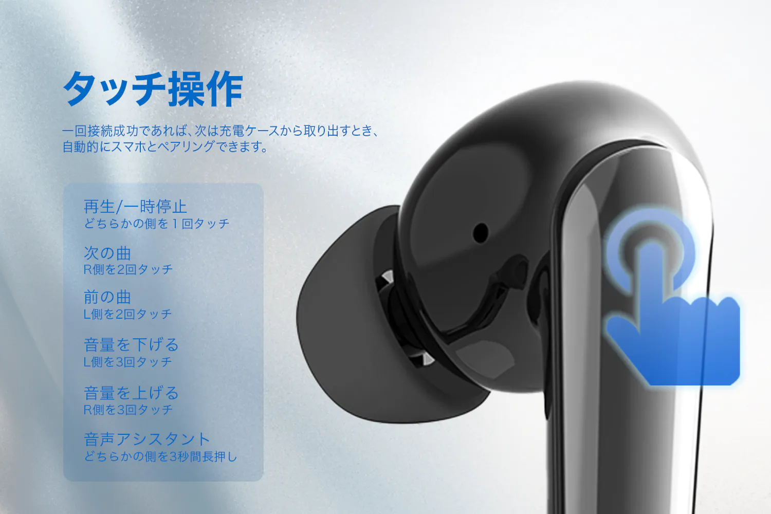 シンプルな操作性と直感的なインターフェースを実現し、誰でも簡単に使える製品を提供します。誰でも簡単に使えるよう、シンプルな操作性を実現しました。タッチセンサーを搭載し、音楽の再生・停止、通話の受信などを直感的に行えます。煩わしい設定は一切不要です。
