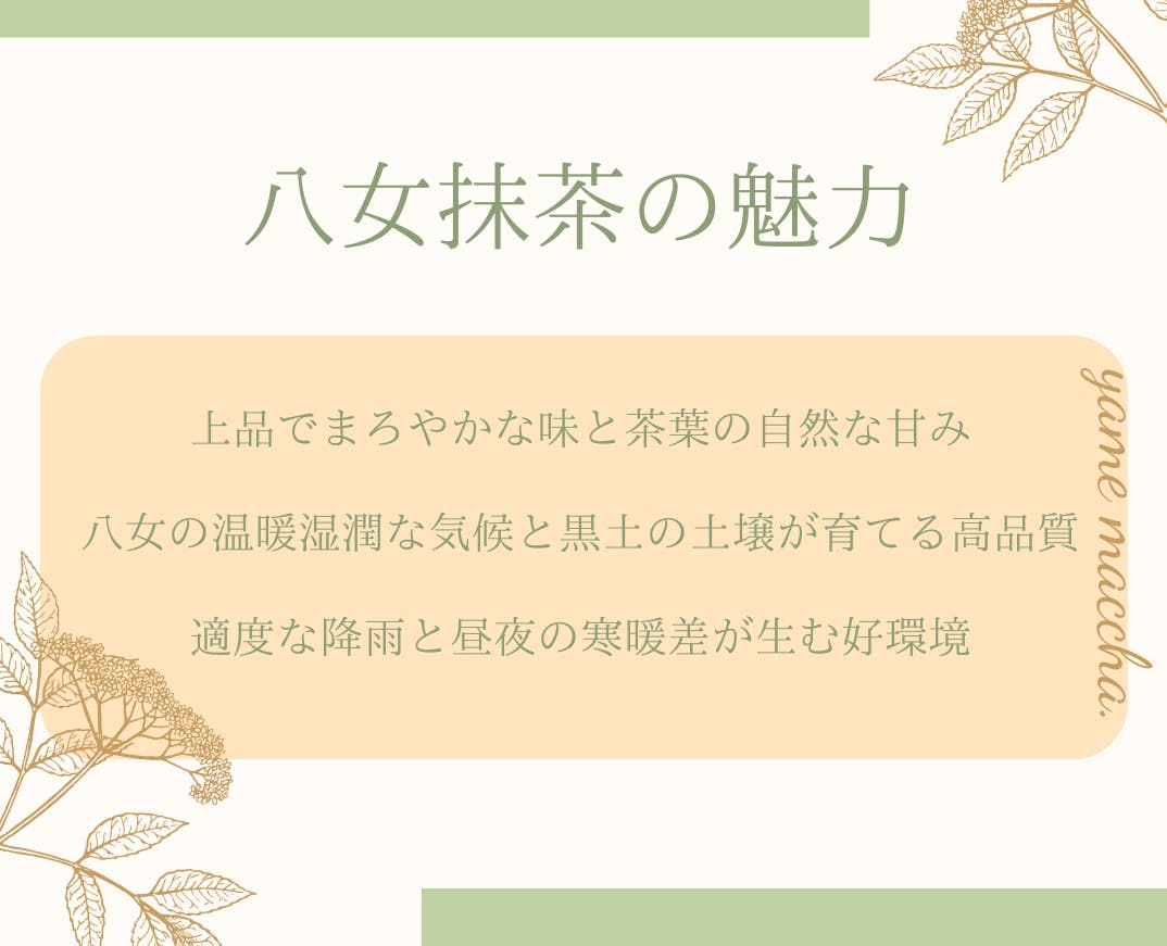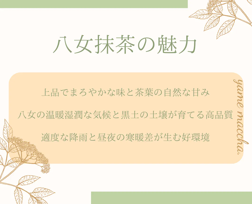 八女抹茶は、福岡県の誇る高品質な抹茶であり、その風味と香りは全国的に評価されています。