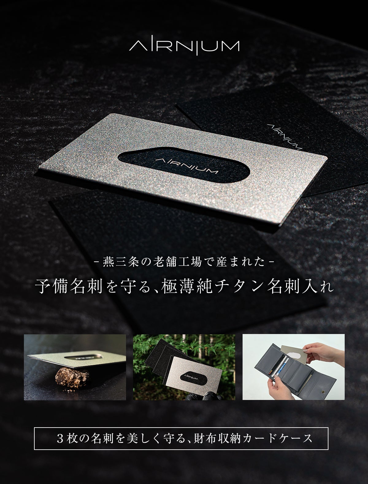 AIRNIUM(エアニウム)は、1.6mmの薄さを実現した、財布に忍ばせる極薄チタン製名刺入れです。最大3枚の名刺を収納でき、急な名刺交換も美しい名刺でスマートに対応。