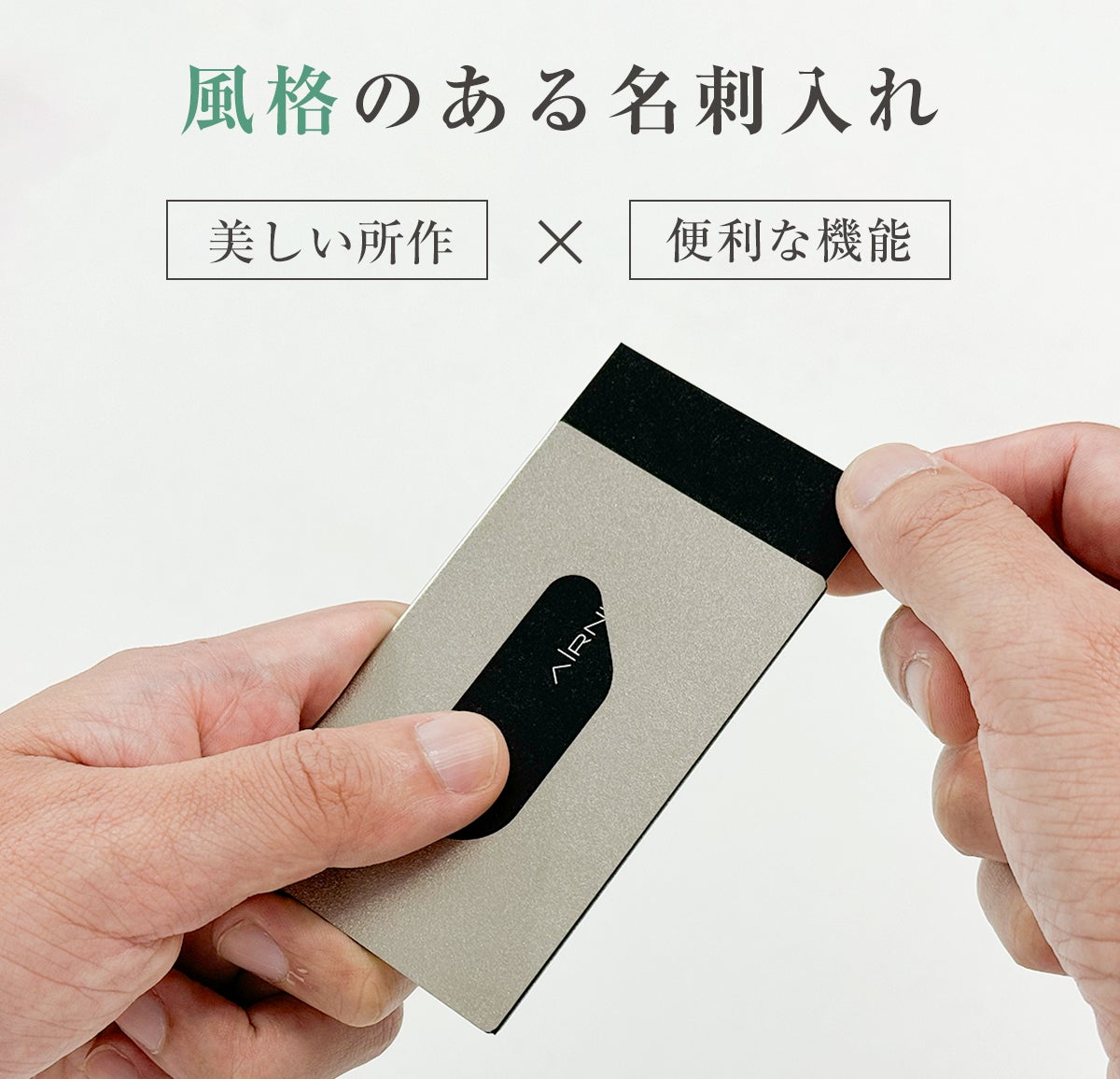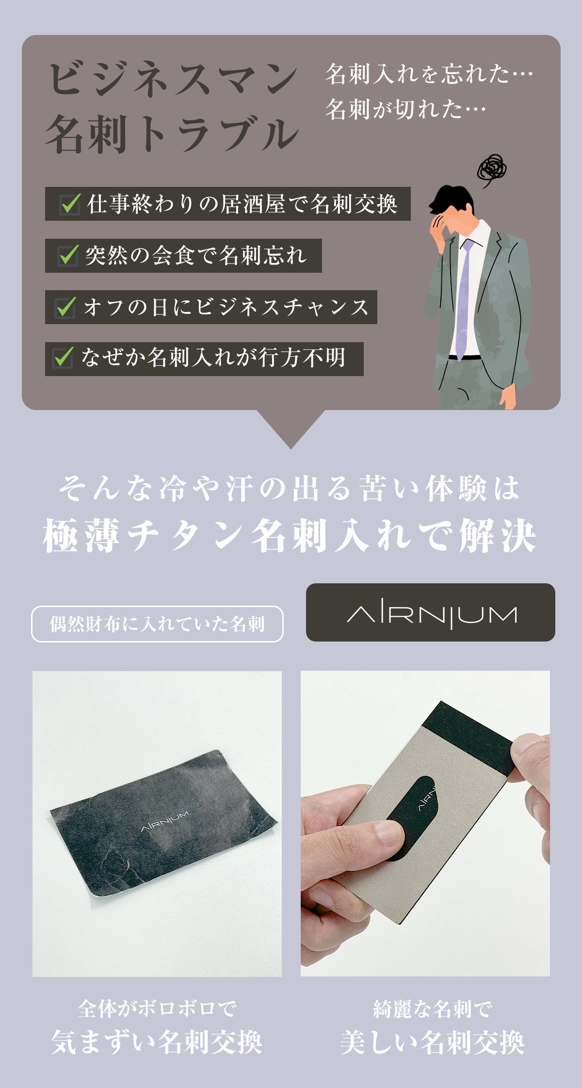 財布に忍ぶ極薄純チタン名刺入れ「AIRNIUM」は、働く人の第一印象に関わる大切な場での困りごとを解決し、「新しい出会いをより素敵なものに」していただきたいという想いを込めて開発されました。