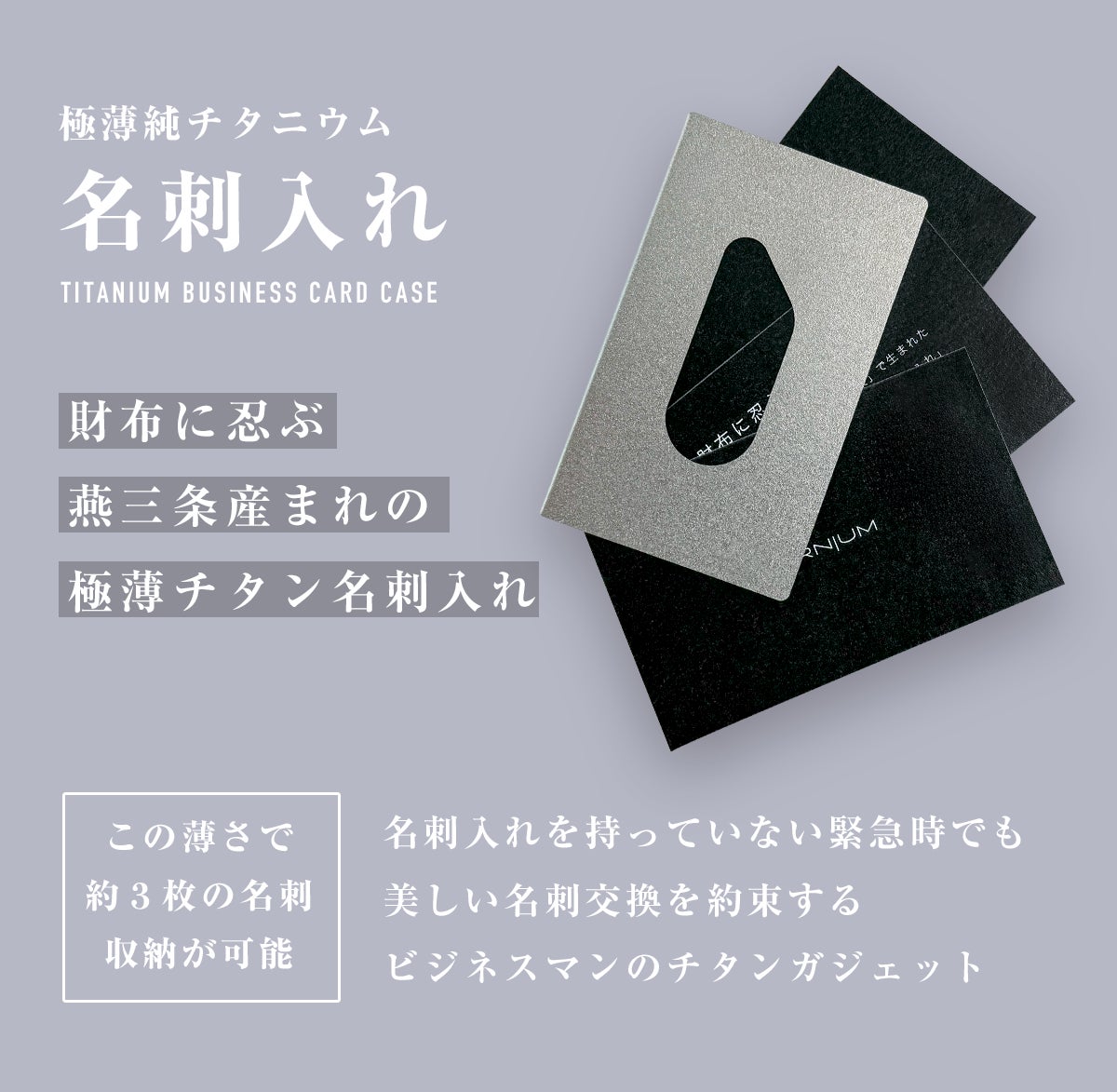素材には、厚み0.3mmに加工された純チタンを使用し、一般的な名刺(厚み0.25mm程度)3枚をしっかりと守ります。