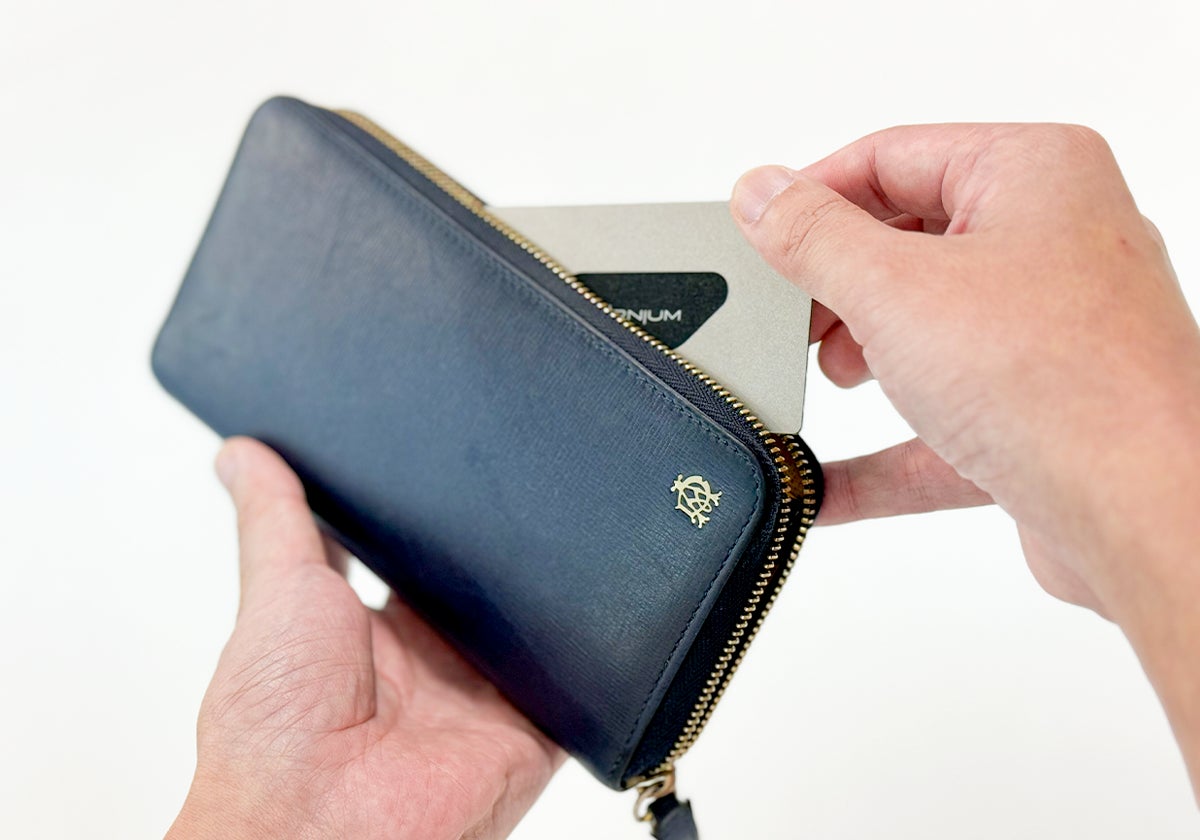 AIRNIUMの寸法は、名刺とほぼ同サイズ。長財布はもちろん、二つ折りや小型、さまざまな財布へ収納できます。