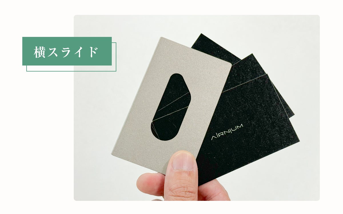 スライド構造によりワンアクションで名刺を露出、もたつくことなくスムーズな動作でスマートに名刺を取り出すことができます。
